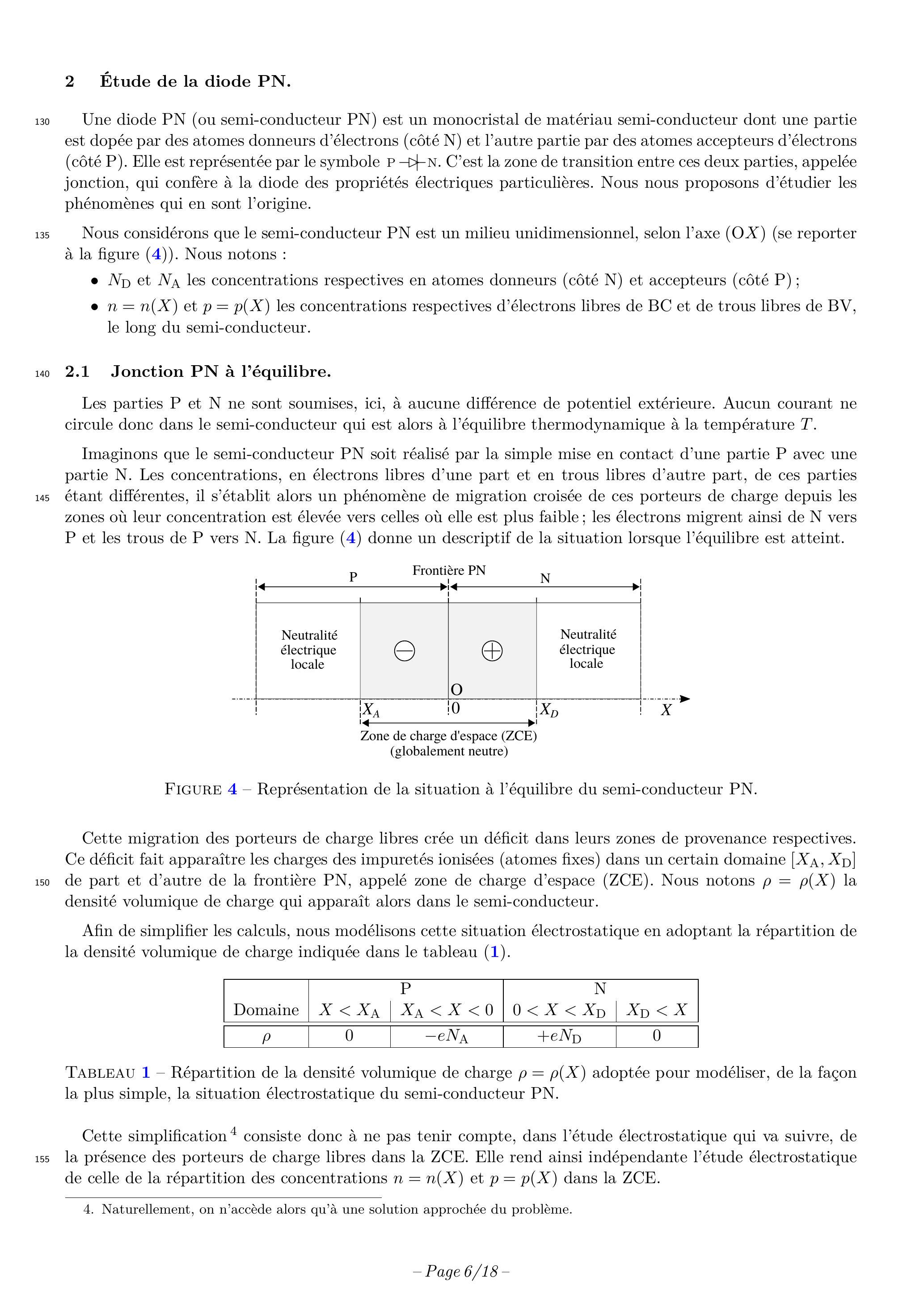 Cette migration des porteurs de charge libres crée un déficit dans leurs zones de provenance respectives. Ce déficit fait apparaître les charges des impuretés ionisées (atomes fixes) dans un certain domaine de part et d'autre de la frontière PN, appelé zone de charge d'espace (ZCE). Nous notons la densité volumique de charge qui apparaît alors dans le semi-conducteur.