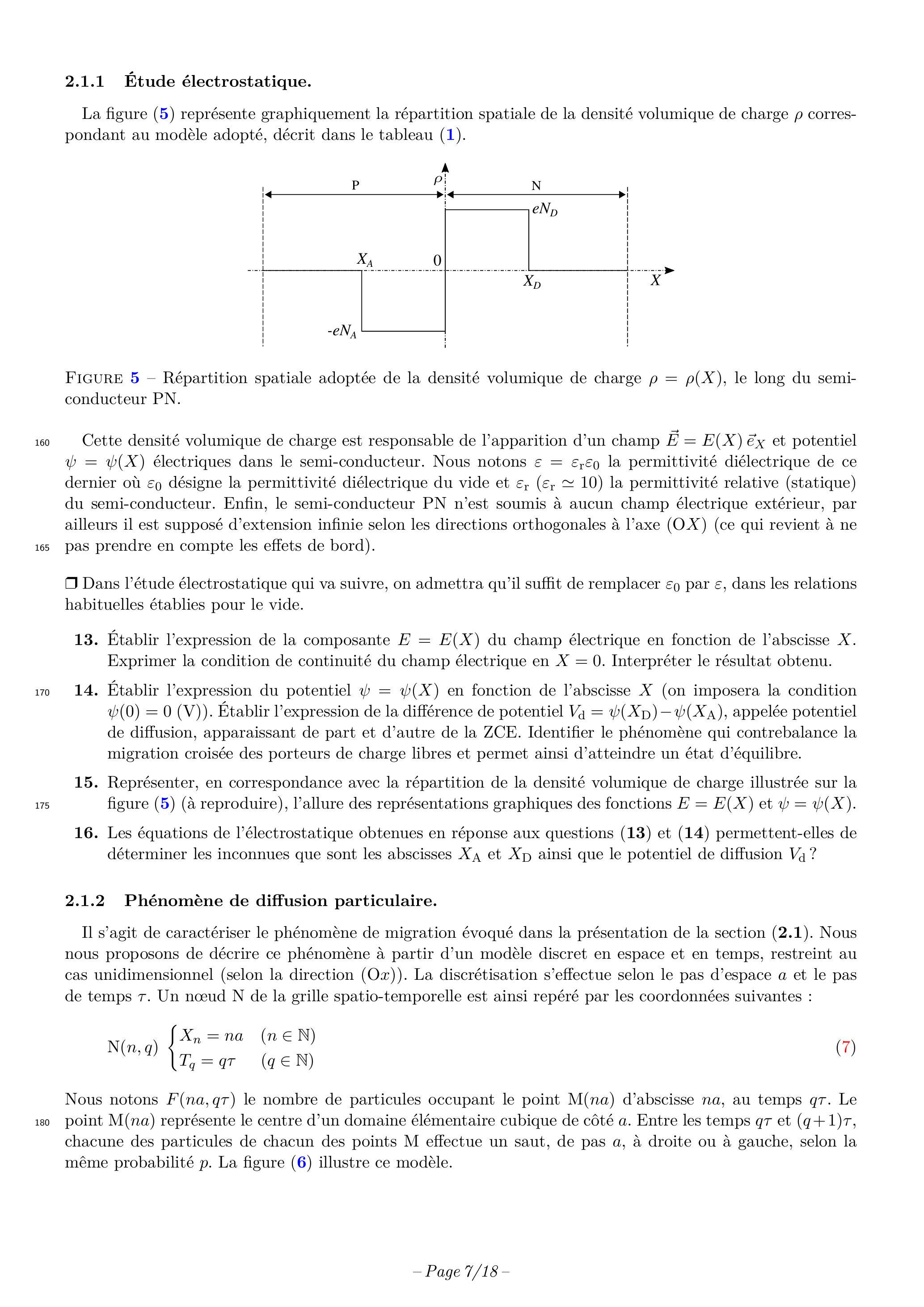 14. Établir l'expression du potentiel en fonction de l'abscisse (on imposera la condition ). Établir l'expression de la différence de potentiel , appelée potentiel de diffusion, apparaissant de part et d'autre de la ZCE. Identifier le phénomène qui contrebalance la migration croisée des porteurs de charge libres et permet ainsi d'atteindre un état d'équilibre.