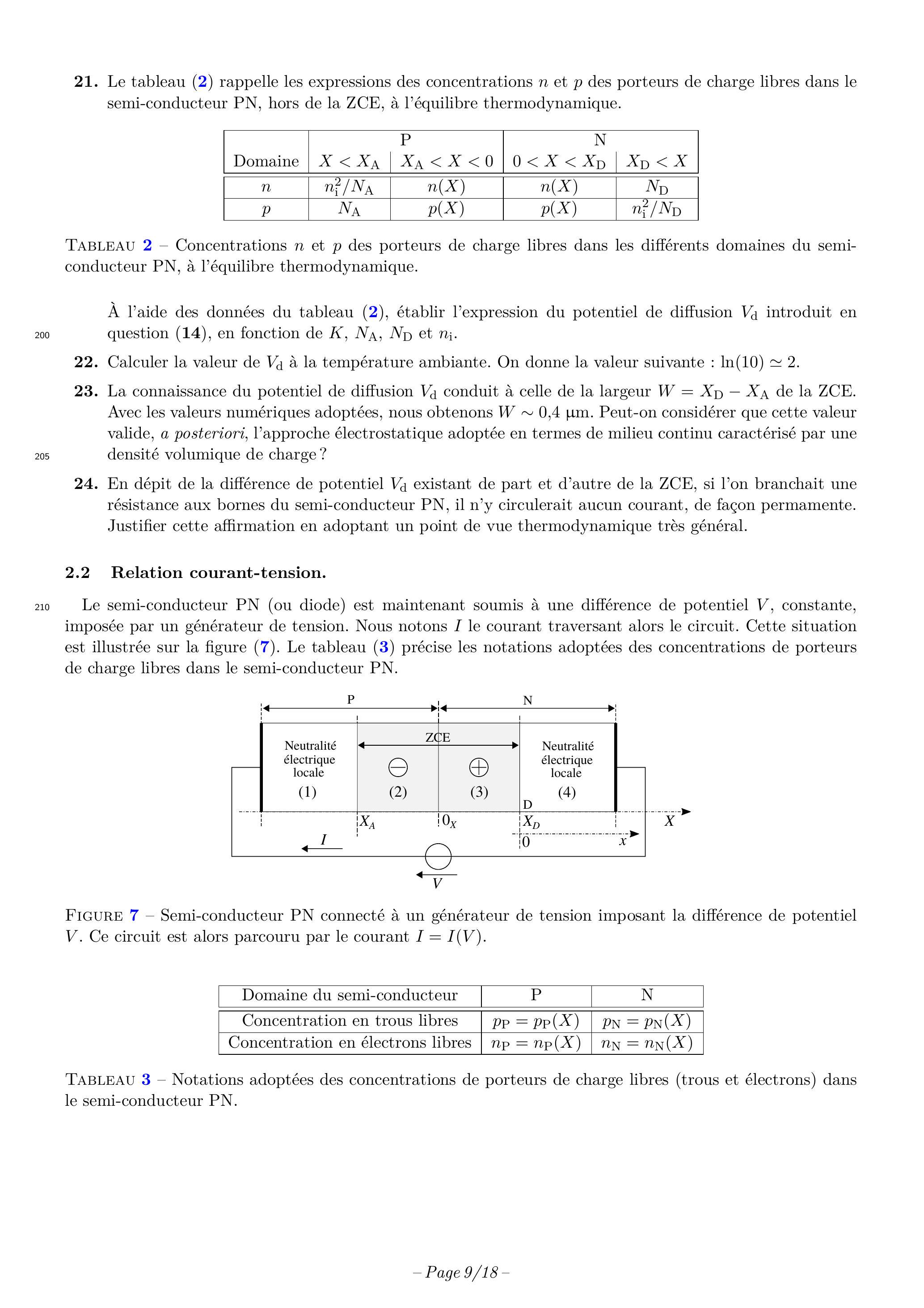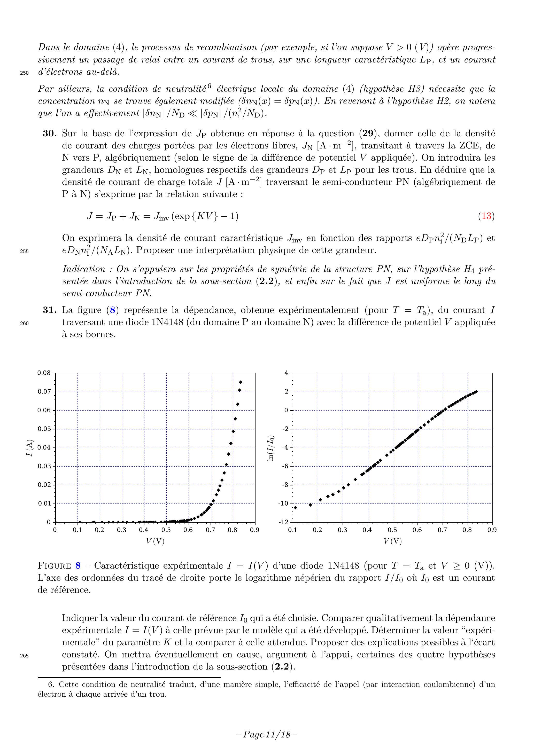 30. Sur la base de l'expression de obtenue en réponse à la question ( ), donner celle de la densité de courant des charges portées par les électrons libres, , transitant à travers la ZCE, de N vers P , algébriquement (selon le signe de la différence de potentiel appliquée). On introduira les grandeurs et , homologues respectifs des grandeurs et pour les trous. En déduire que la densité de courant de charge totale traversant le semi-conducteur PN (algébriquement de P à N ) s'exprime par la relation suivante :
