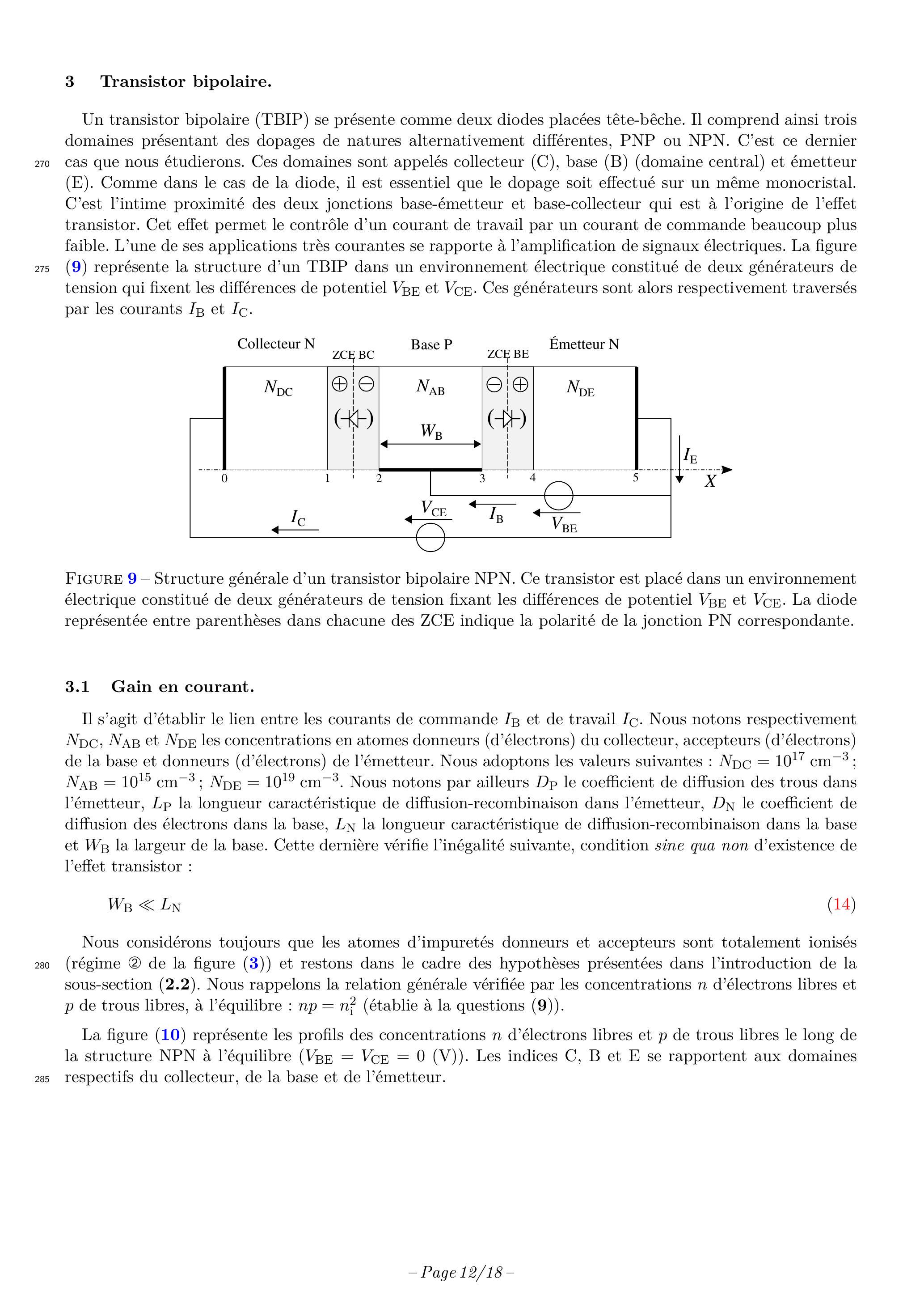 Il s'agit d'établir le lien entre les courants de commande et de travail . Nous notons respectivement et les concentrations en atomes donneurs (d'électrons) du collecteur, accepteurs (d'électrons) de la base et donneurs (d'électrons) de l'émetteur. Nous adoptons les valeurs suivantes : ; . Nous notons par ailleurs le coefficient de diffusion des trous dans l'émetteur, la longueur caractéristique de diffusion-recombinaison dans l'émetteur, le coefficient de diffusion des électrons dans la base, la longueur caractéristique de diffusion-recombinaison dans la base et la largeur de la base. Cette dernière vérifie l'inégalité suivante, condition sine qua non d'existence de l'effet transistor :