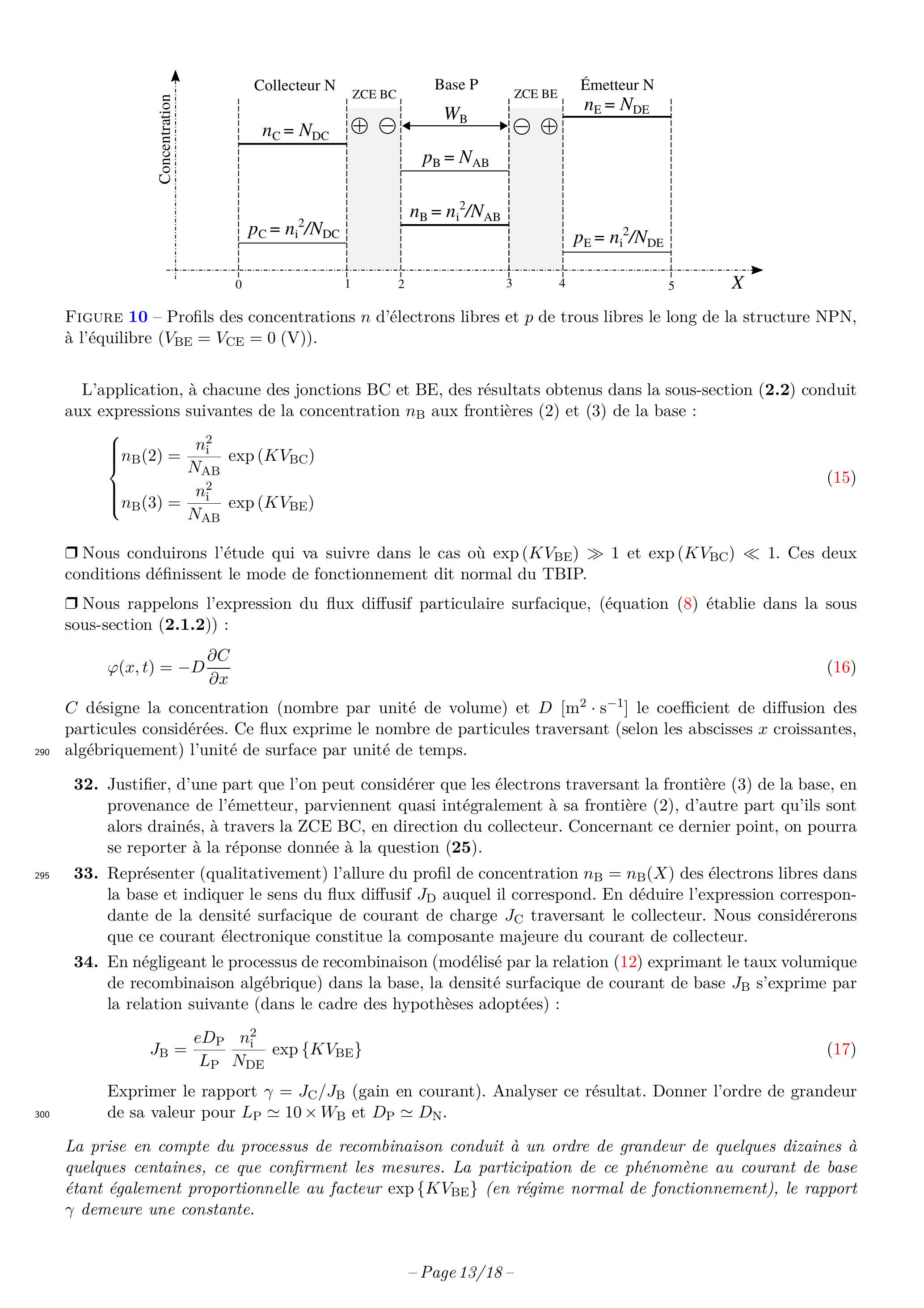32. Justifier, d'une part que l'on peut considérer que les électrons traversant la frontière (3) de la base, en provenance de l'émetteur, parviennent quasi intégralement à sa frontière (2), d'autre part qu'ils sont alors drainés, à travers la ZCE BC, en direction du collecteur. Concernant ce dernier point, on pourra se reporter à la réponse donnée à la question (25).
