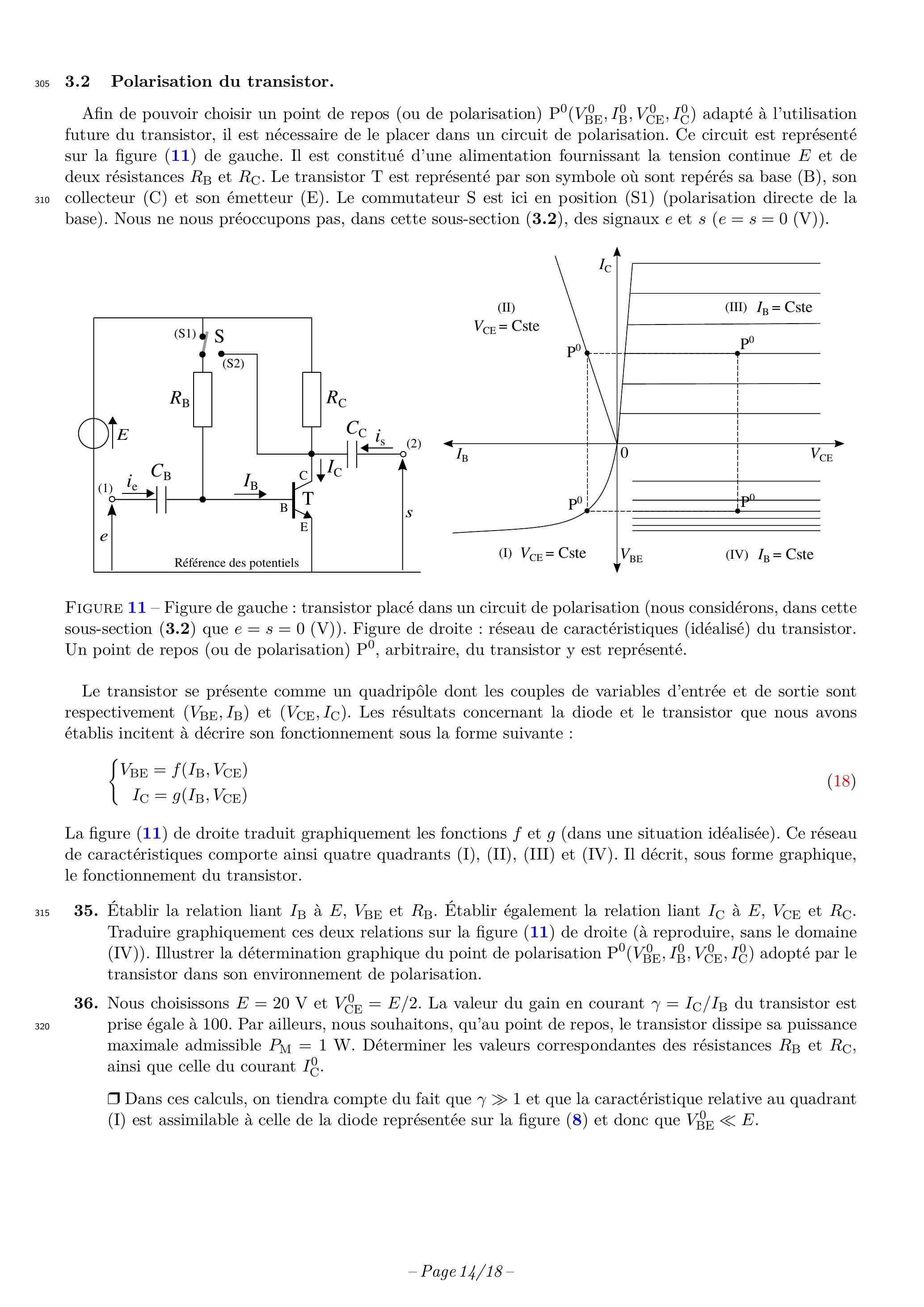 35. Établir la relation liant à et . Établir également la relation liant à et . Traduire graphiquement ces deux relations sur la figure (11) de droite (à reproduire, sans le domaine (IV)). Illustrer la détermination graphique du point de polarisation adopté par le transistor dans son environnement de polarisation.