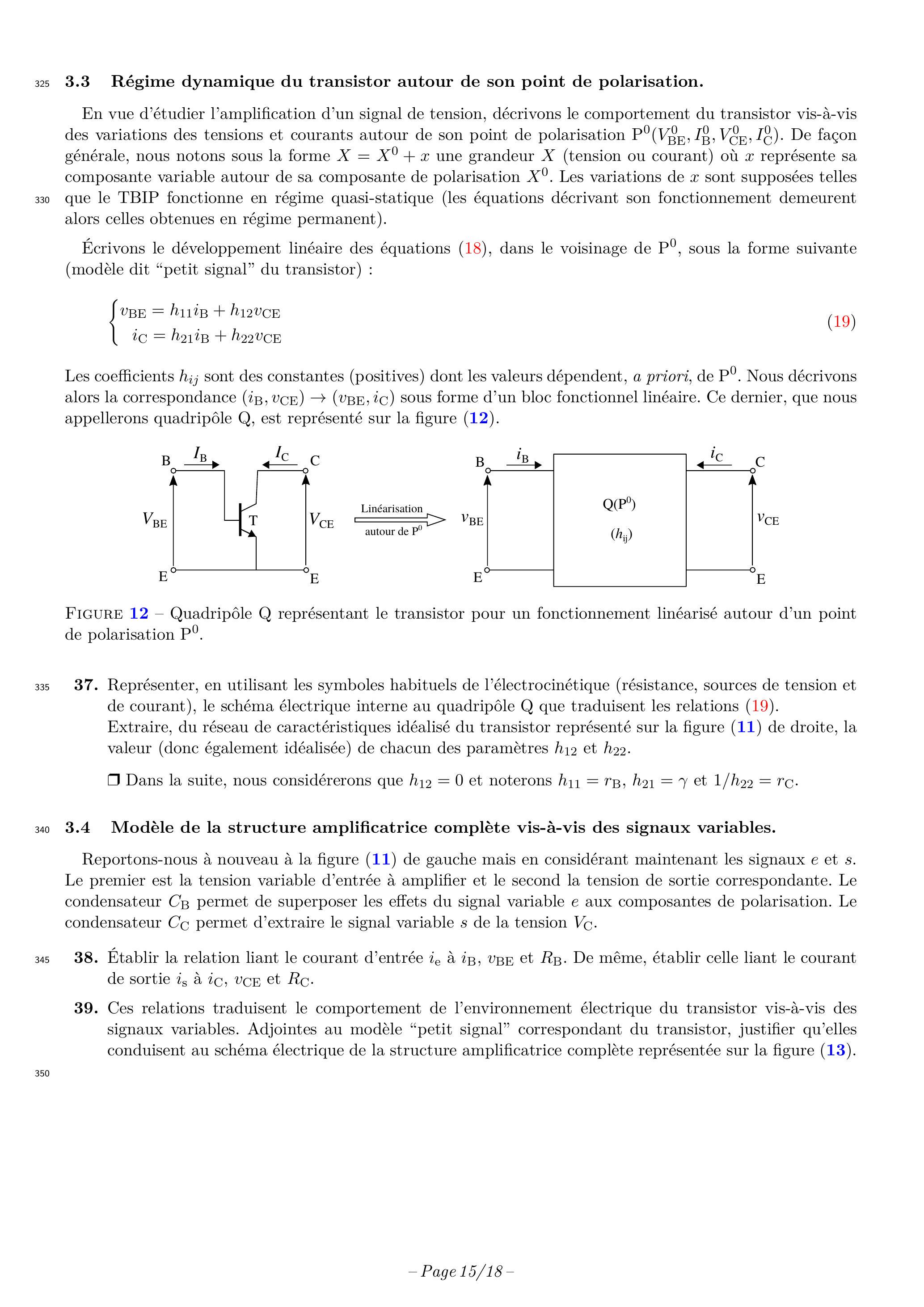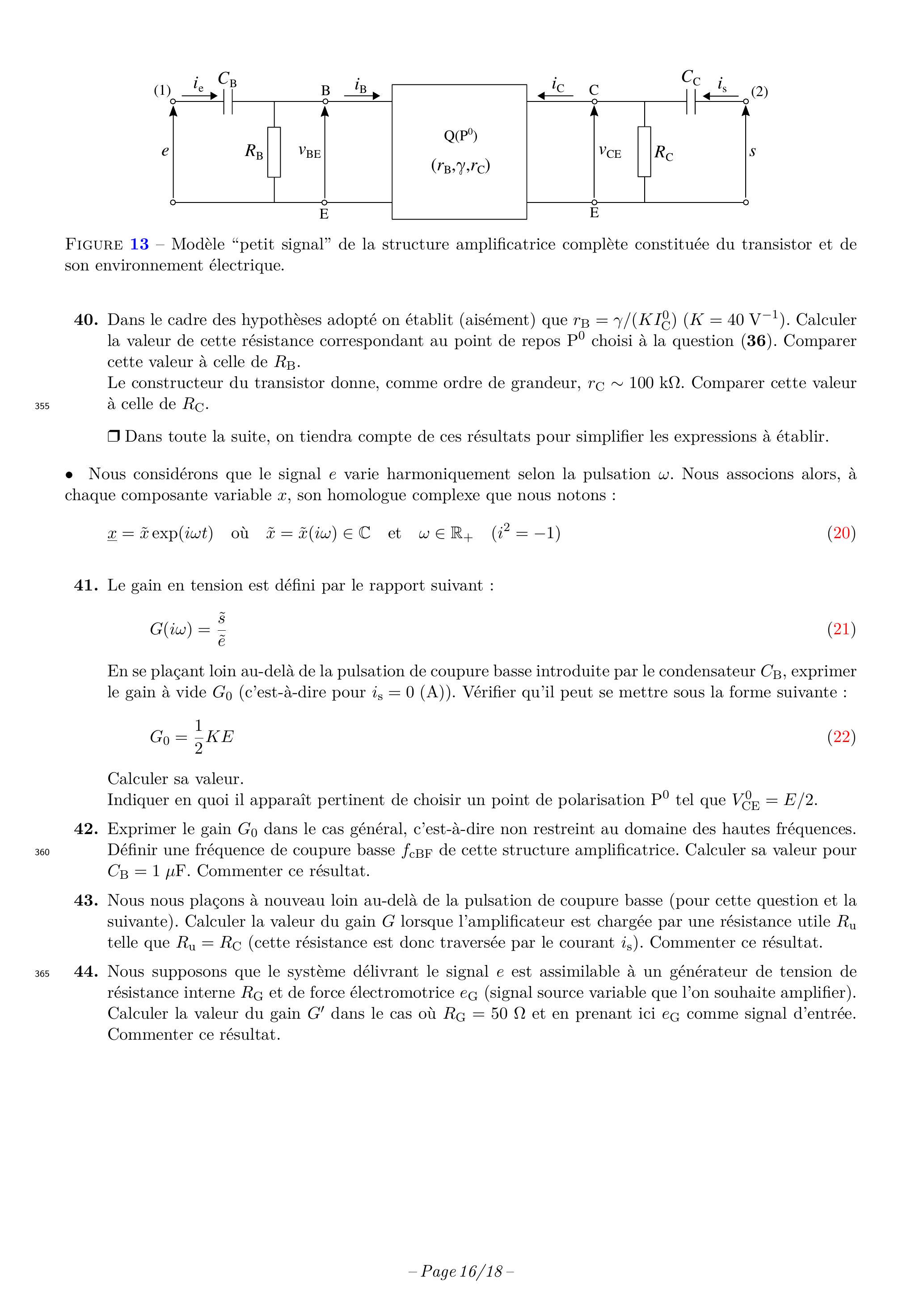 39. Ces relations traduisent le comportement de l'environnement électrique du transistor vis-à-vis des signaux variables. Adjointes au modèle "petit signal" correspondant du transistor, justifier qu'elles conduisent au schéma électrique de la structure amplificatrice complète représentée sur la figure (13).