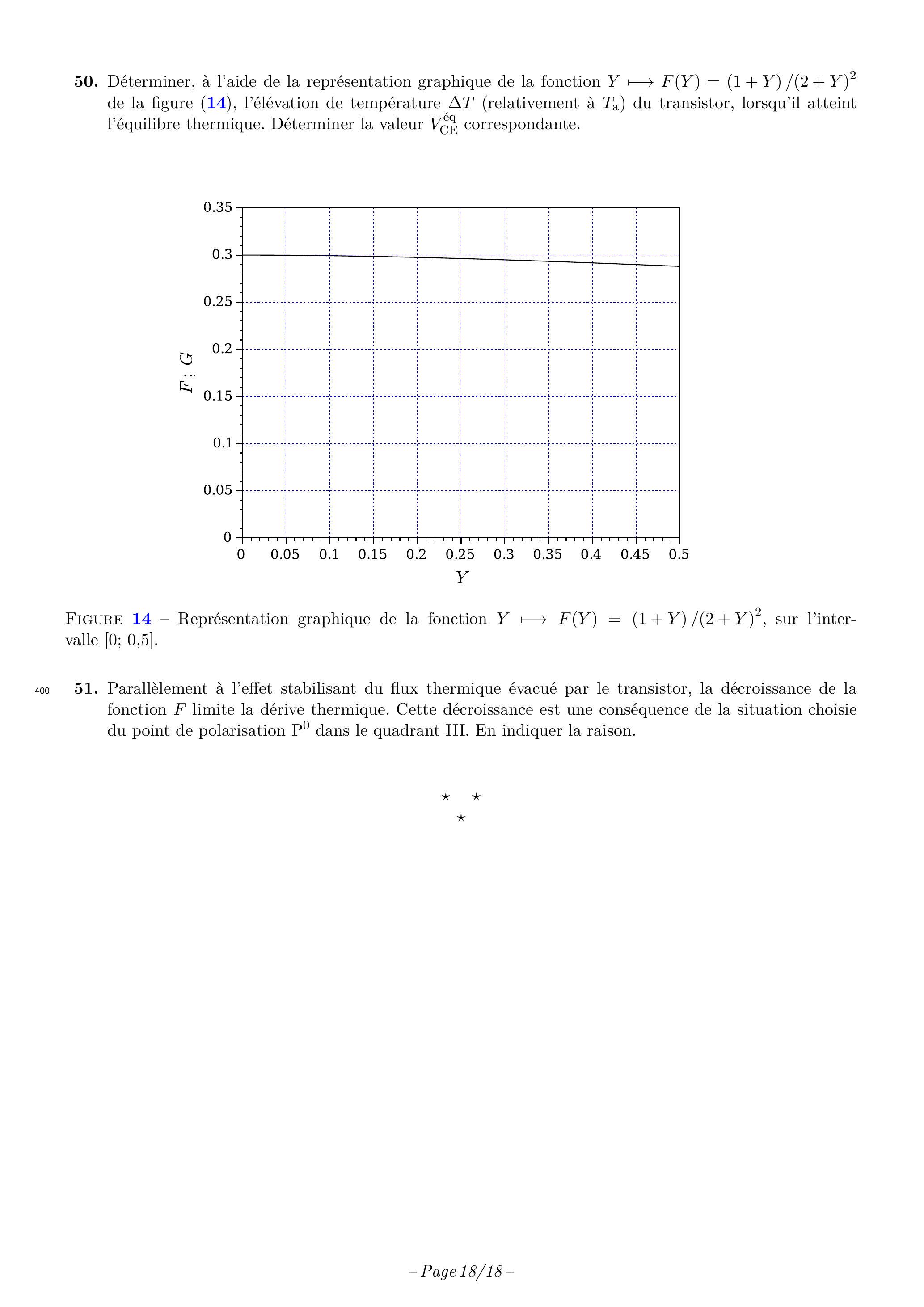 50. Déterminer, à l'aide de la représentation graphique de la fonction de la figure (14), l'élévation de température (relativement à ) du transistor, lorsqu'il atteint l'équilibre thermique. Déterminer la valeur é correspondante.