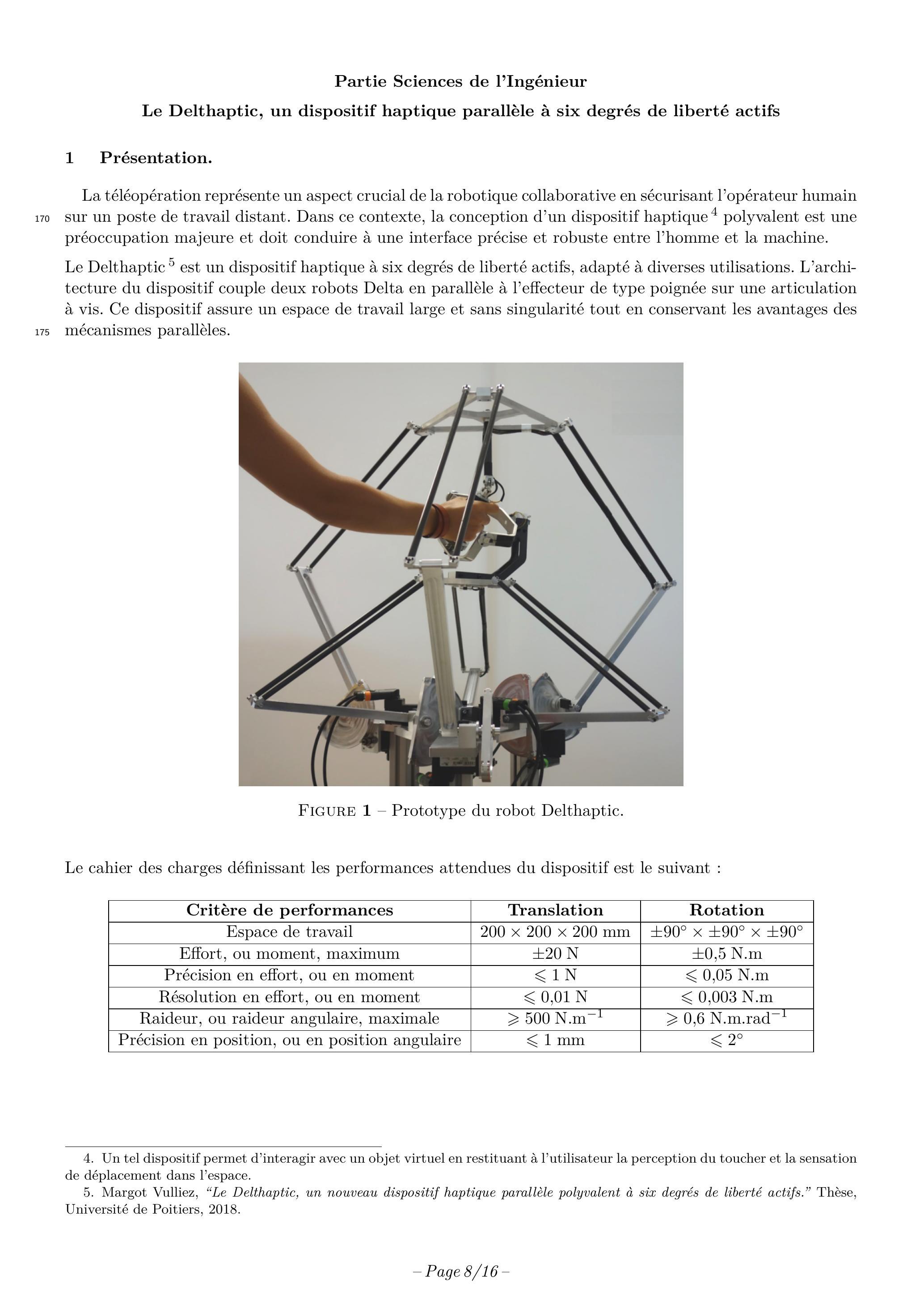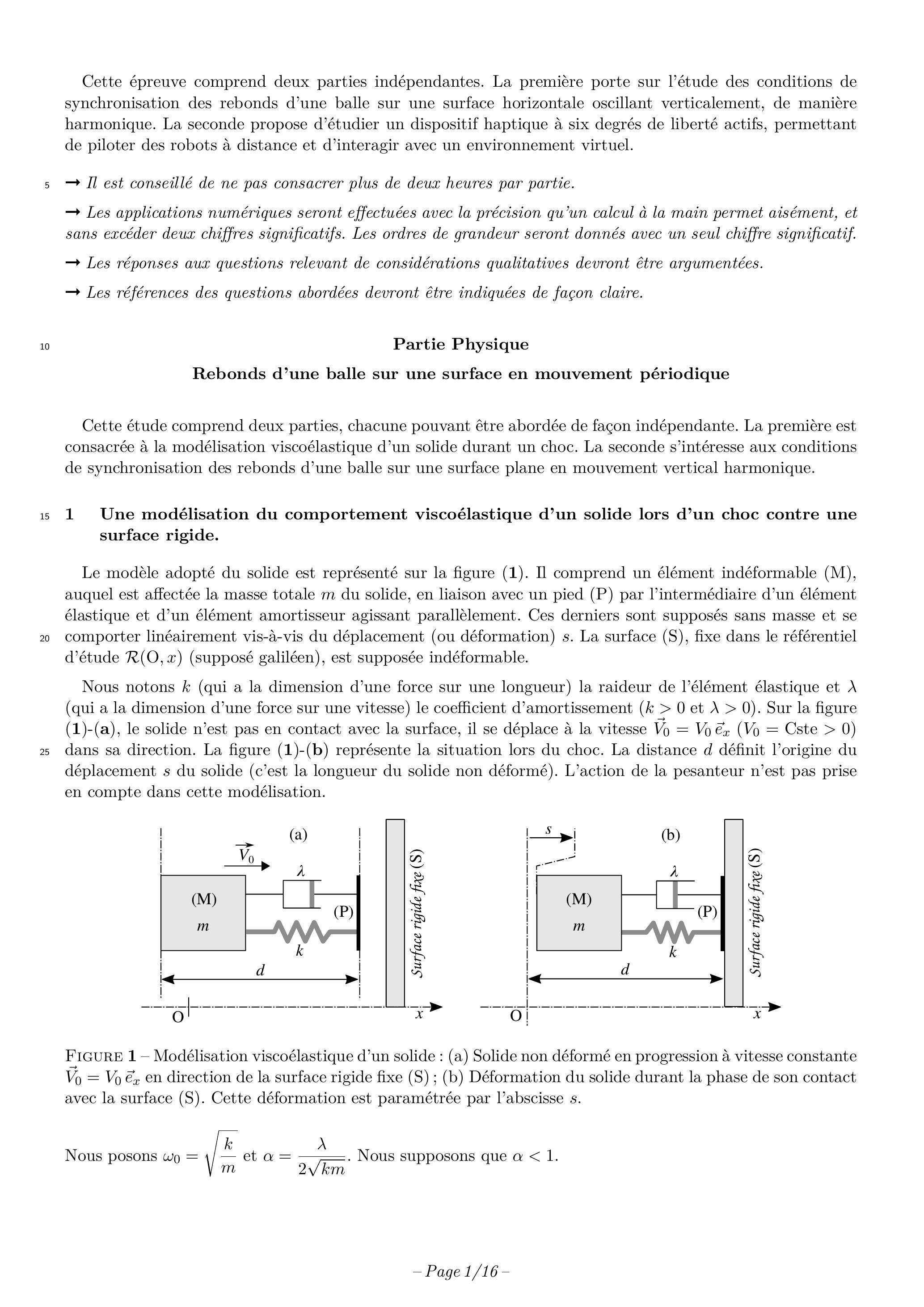 Cette épreuve comprend deux parties indépendantes. La première porte sur l'étude des conditions de synchronisation des rebonds d'une balle sur une surface horizontale oscillant verticalement, de manière harmonique. La seconde propose d'étudier un dispositif haptique à six degrés de liberté actifs, permettant de piloter des robots à distance et d'interagir avec un environnement virtuel. Il est conseillé de ne pas consacrer plus de deux heures par partie. Les applications numériques seront effectuées avec la précision qu'un calcul à la main permet aisément, et sans excéder deux chiffres significatifs. Les ordres de grandeur seront donnés avec un seul chiffre significatif. Les réponses aux questions relevant de considérations qualitatives devront être argumentées. Les références des questions abordées devront être indiquées de façon claire.