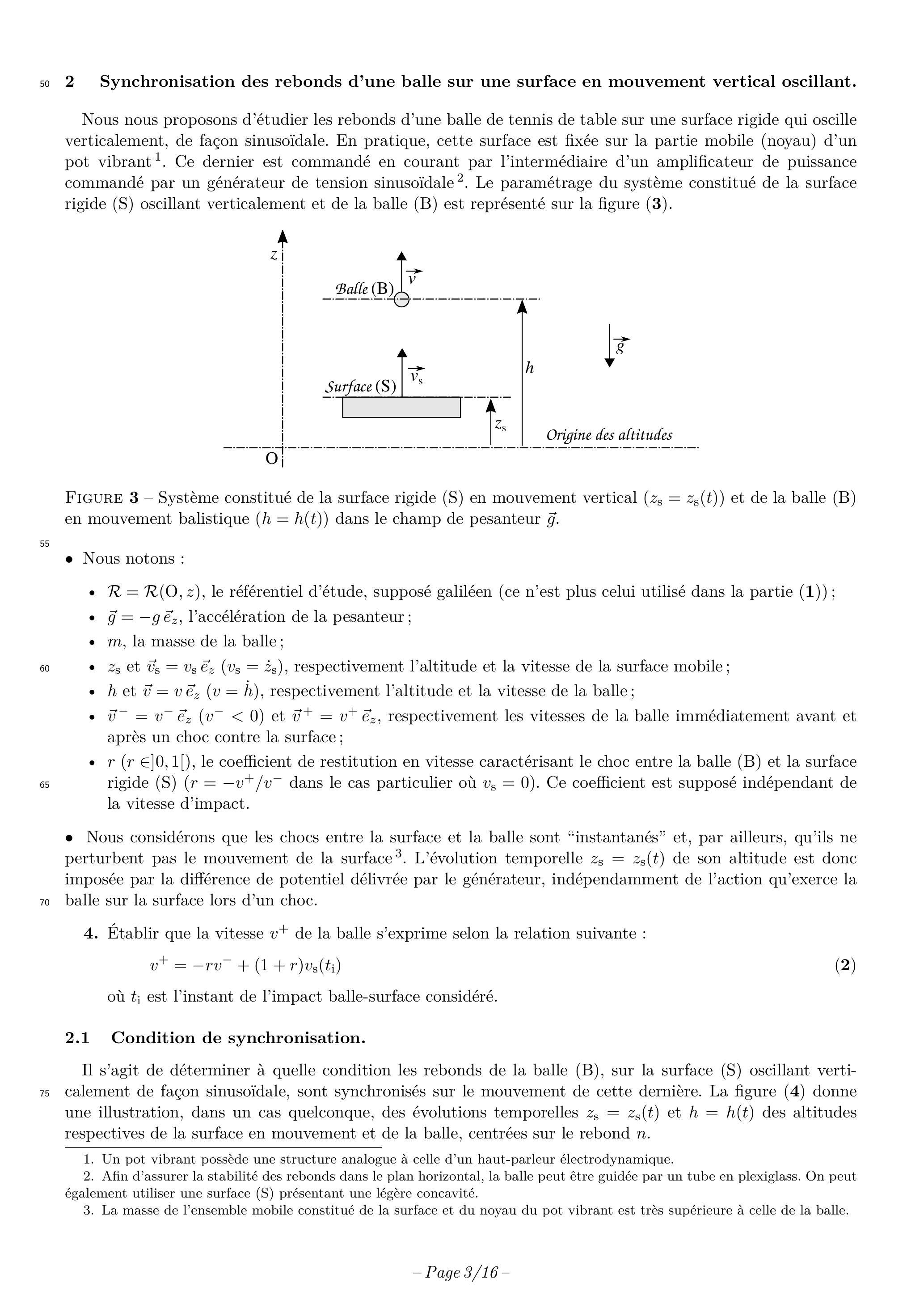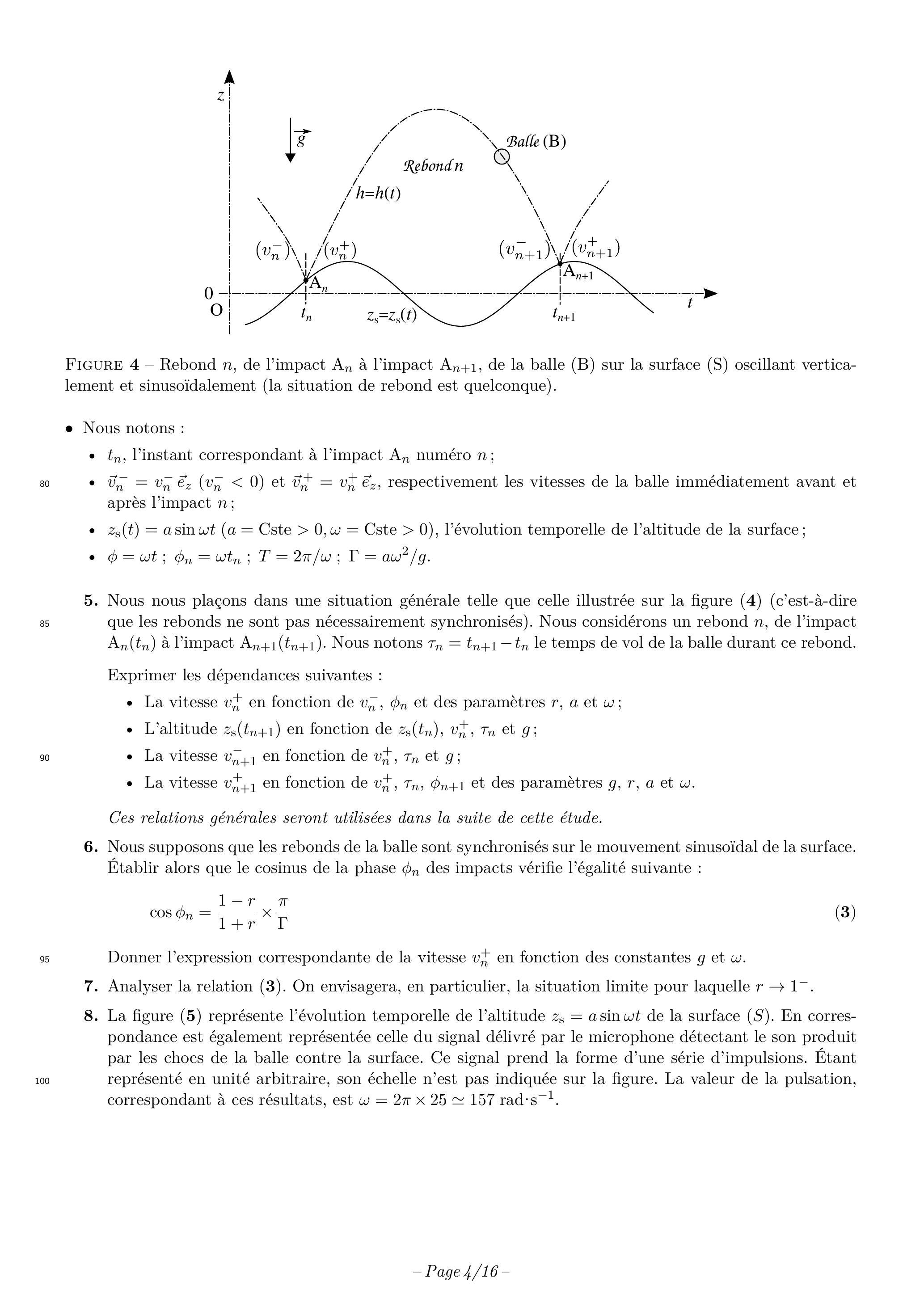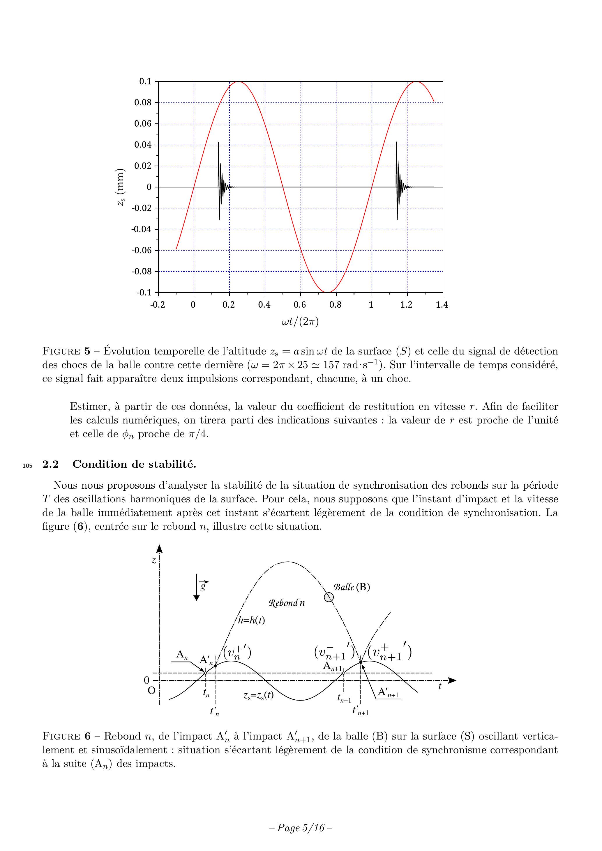 Il s'agit de déterminer à quelle condition les rebonds de la balle (B), sur la surface (S) oscillant verti- calement de façon sinusoïdale, sont synchronisés sur le mouvement de cette dernière. La figure (4) donne une illustration, dans un cas quelconque, des évolutions temporelles et des altitudes respectives de la surface en mouvement et de la balle, centrées sur le rebond .