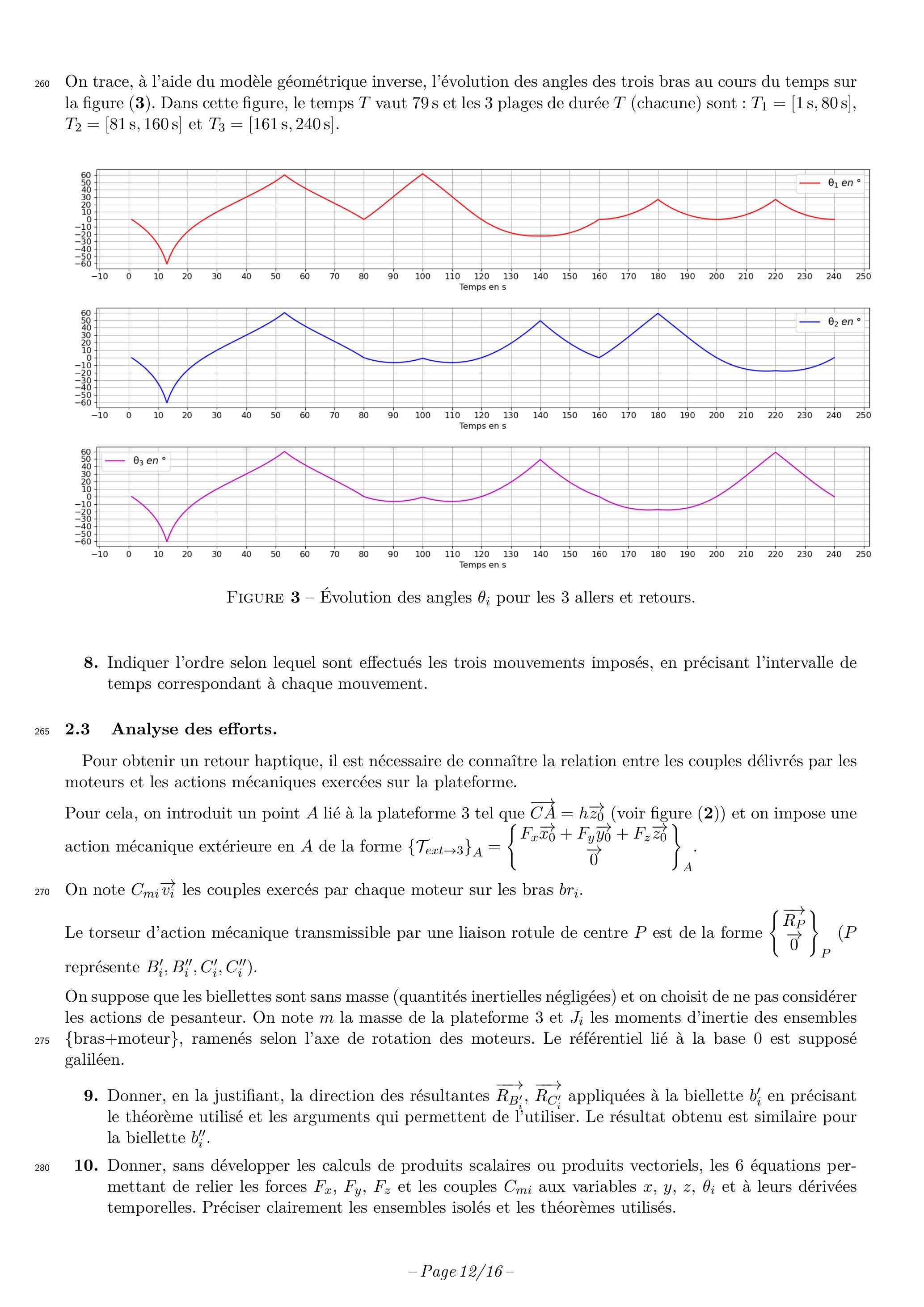 On trace, à l'aide du modèle géométrique inverse, l'évolution des angles des trois bras au cours du temps sur la figure (3). Dans cette figure, le temps vaut 79 s et les 3 plages de durée (chacune) sont : , et .