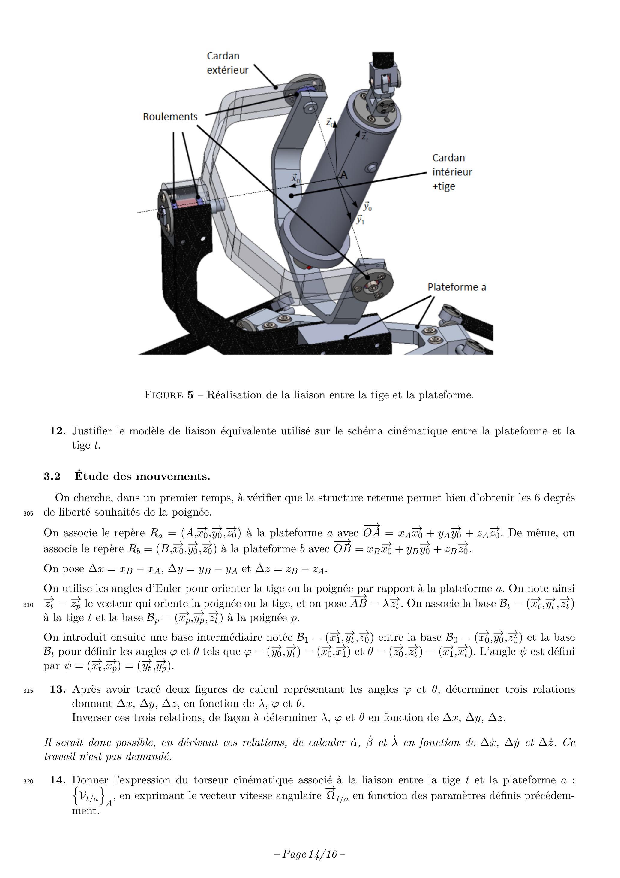 14. Donner l'expression du torseur cinématique associé à la liaison entre la tige et la plateforme : , en exprimant le vecteur vitesse angulaire en fonction des paramètres définis précédemment.