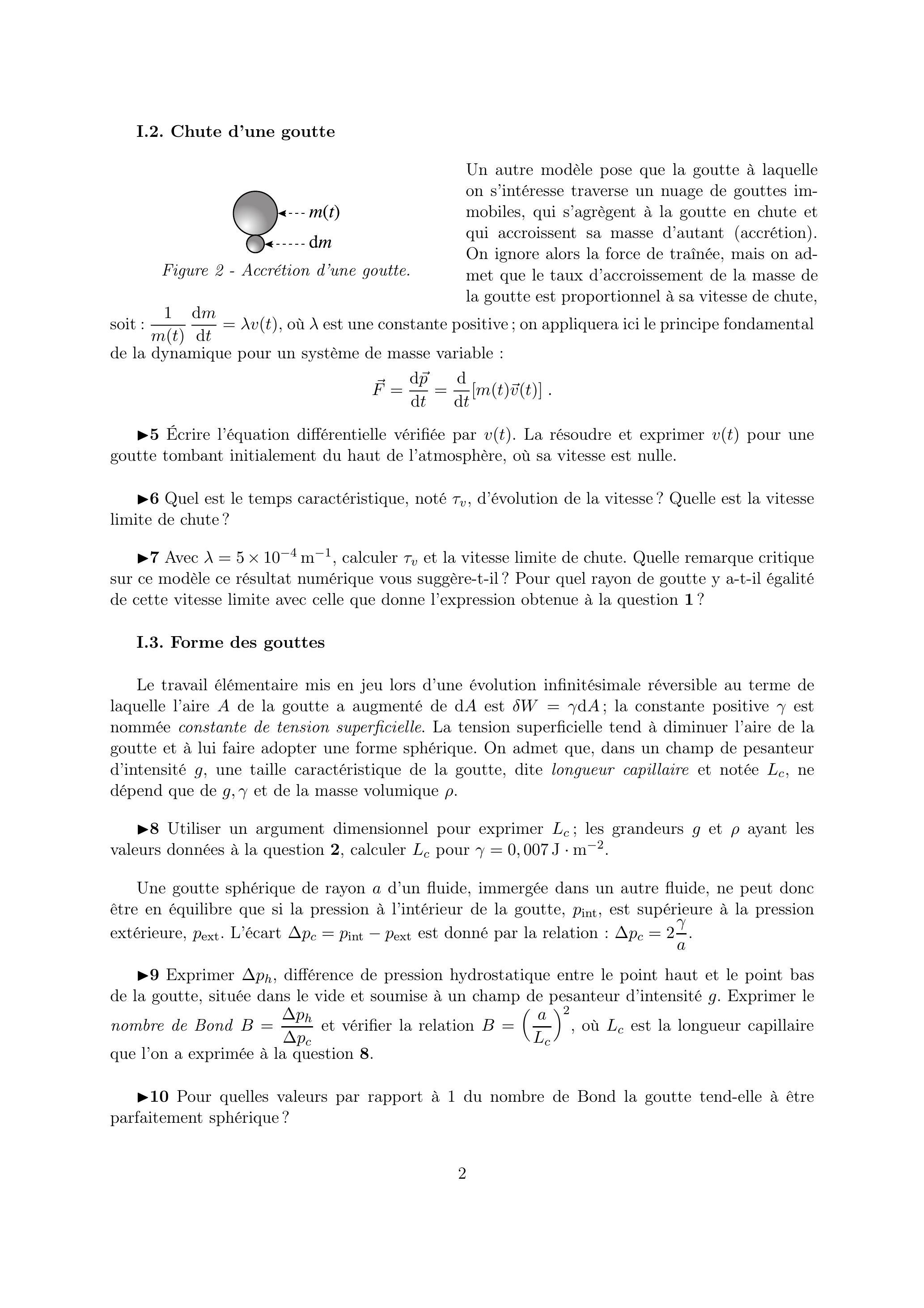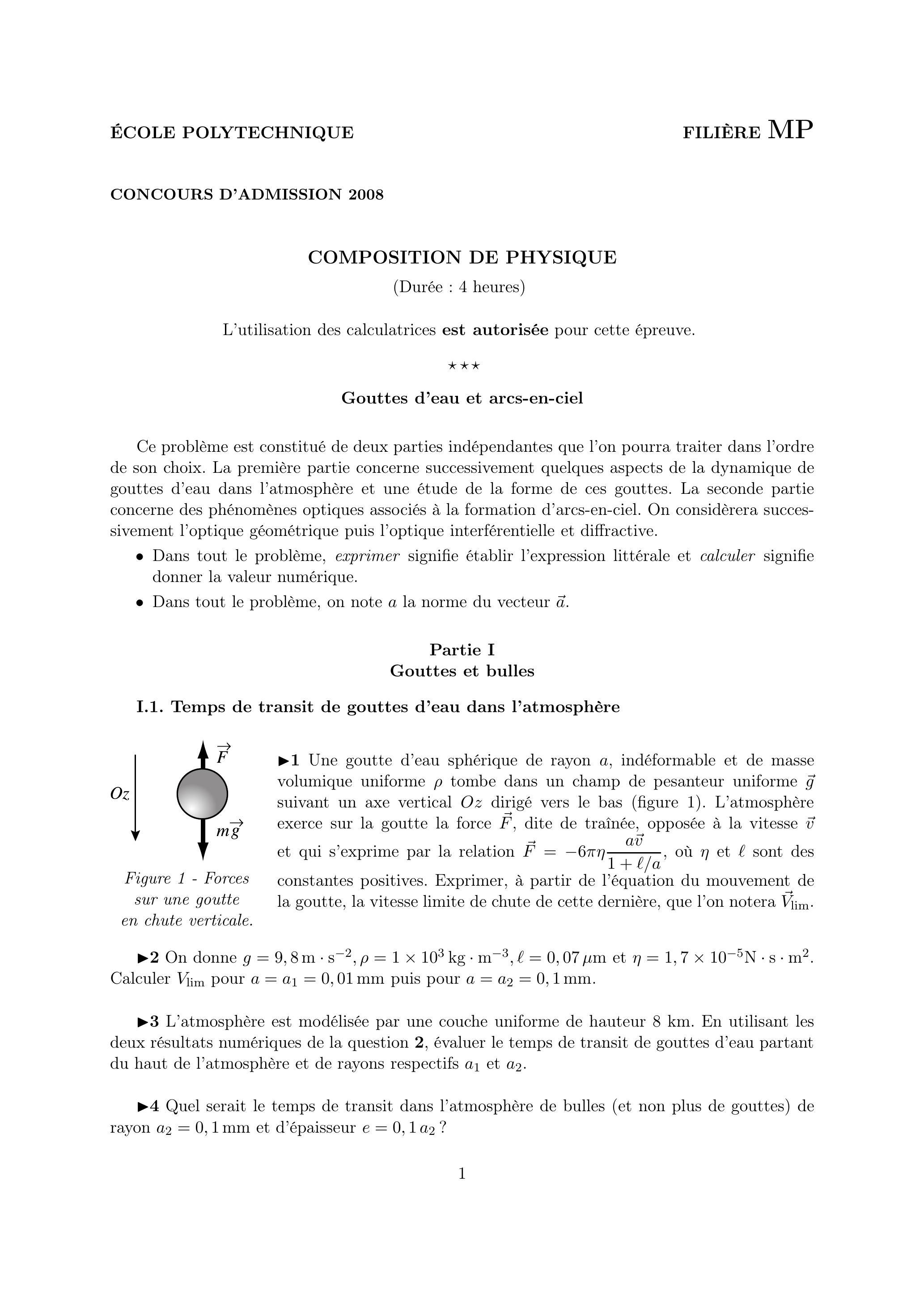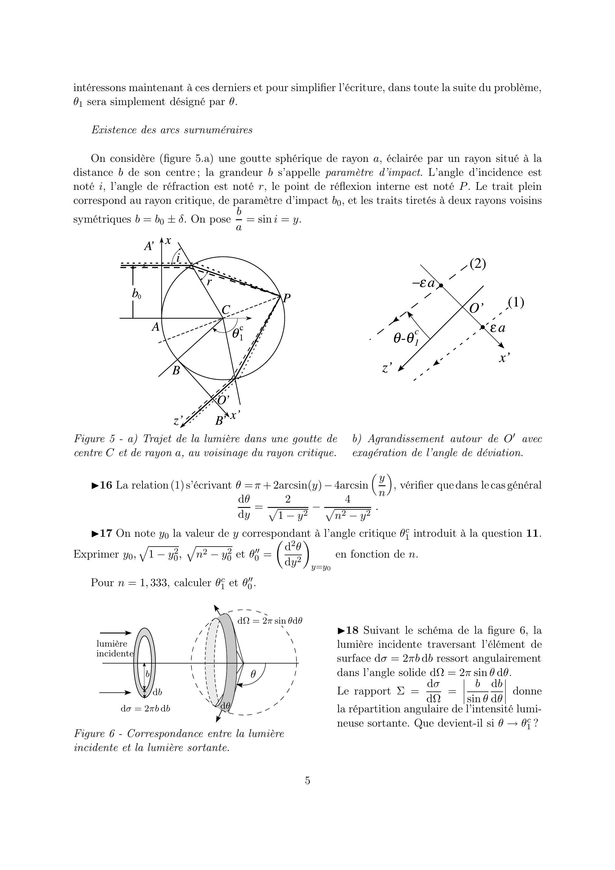 Ce problème est constitué de deux parties indépendantes que l'on pourra traiter dans l'ordre de son choix. La première partie concerne successivement quelques aspects de la dynamique de gouttes d'eau dans l'atmosphère et une étude de la forme de ces gouttes. La seconde partie concerne des phénomènes optiques associés à la formation d'arcs-en-ciel. On considèrera successivement l'optique géométrique puis l'optique interférentielle et diffractive.