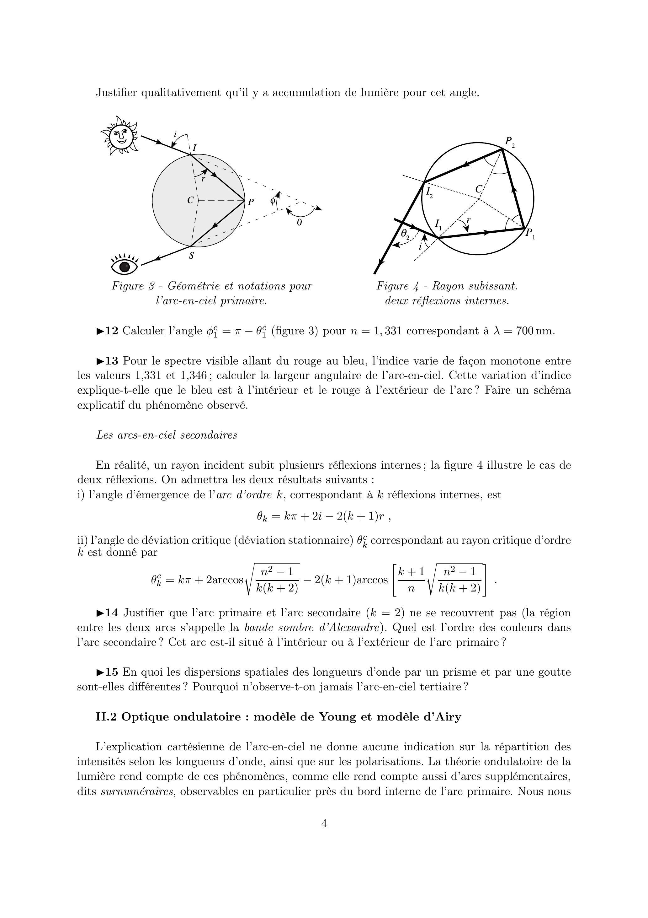 -14 Justifier que l'arc primaire et l'arc secondaire ( ) ne se recouvrent pas (la région entre les deux arcs s'appelle la bande sombre d'Alexandre). Quel est l'ordre des couleurs dans l'arc secondaire? Cet arc est-il situé à l'intérieur ou à l'extérieur de l'arc primaire?