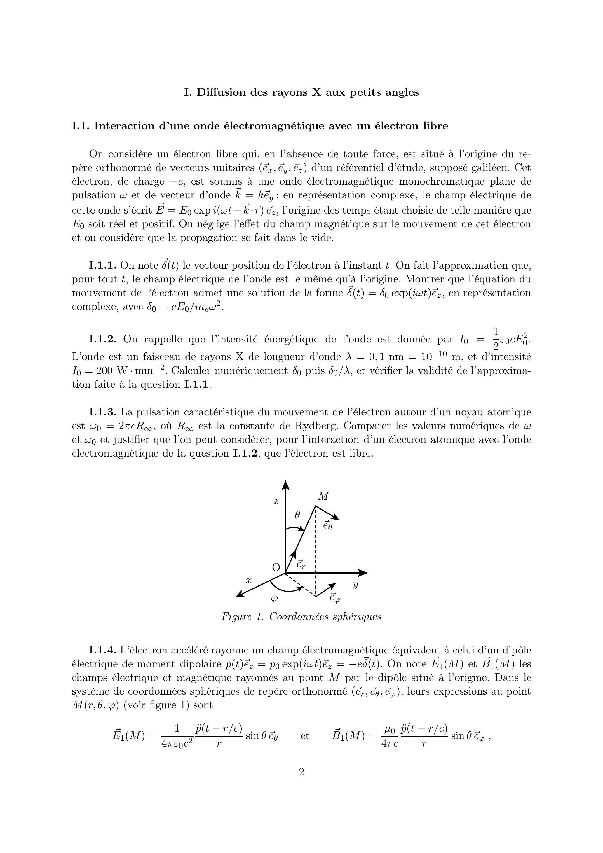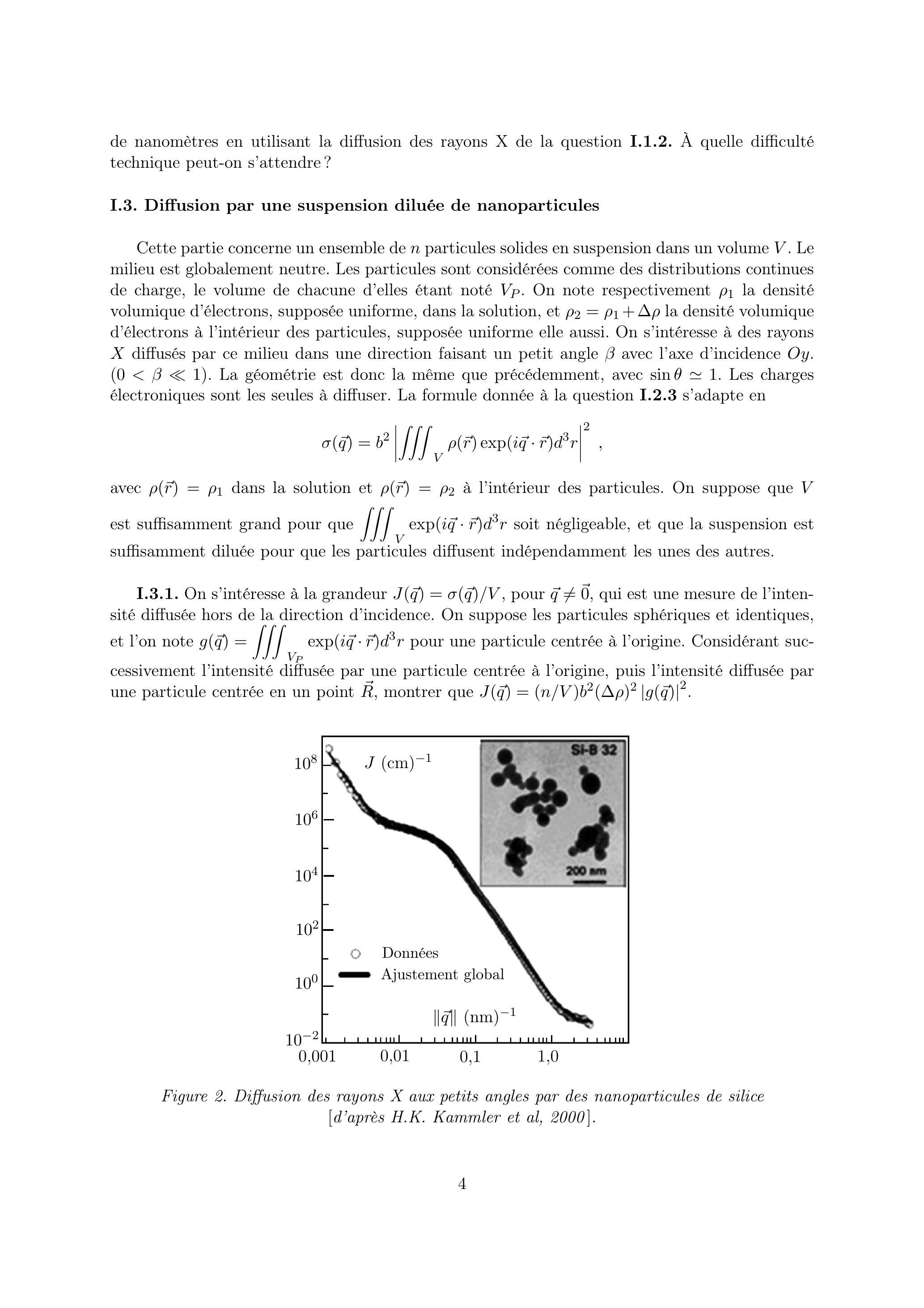 Cette partie concerne un ensemble de particules solides en suspension dans un volume . Le milieu est globalement neutre. Les particules sont considérées comme des distributions continues de charge, le volume de chacune d'elles étant noté . On note respectivement la densité volumique d'électrons, supposée uniforme, dans la solution, et la densité volumique d'électrons à l'intérieur des particules, supposée uniforme elle aussi. On s'intéresse à des rayons diffusés par ce milieu dans une direction faisant un petit angle avec l'axe d'incidence . . La géométrie est donc la même que précédemment, avec . Les charges électroniques sont les seules à diffuser. La formule donnée à la question I.2.3 s'adapte en