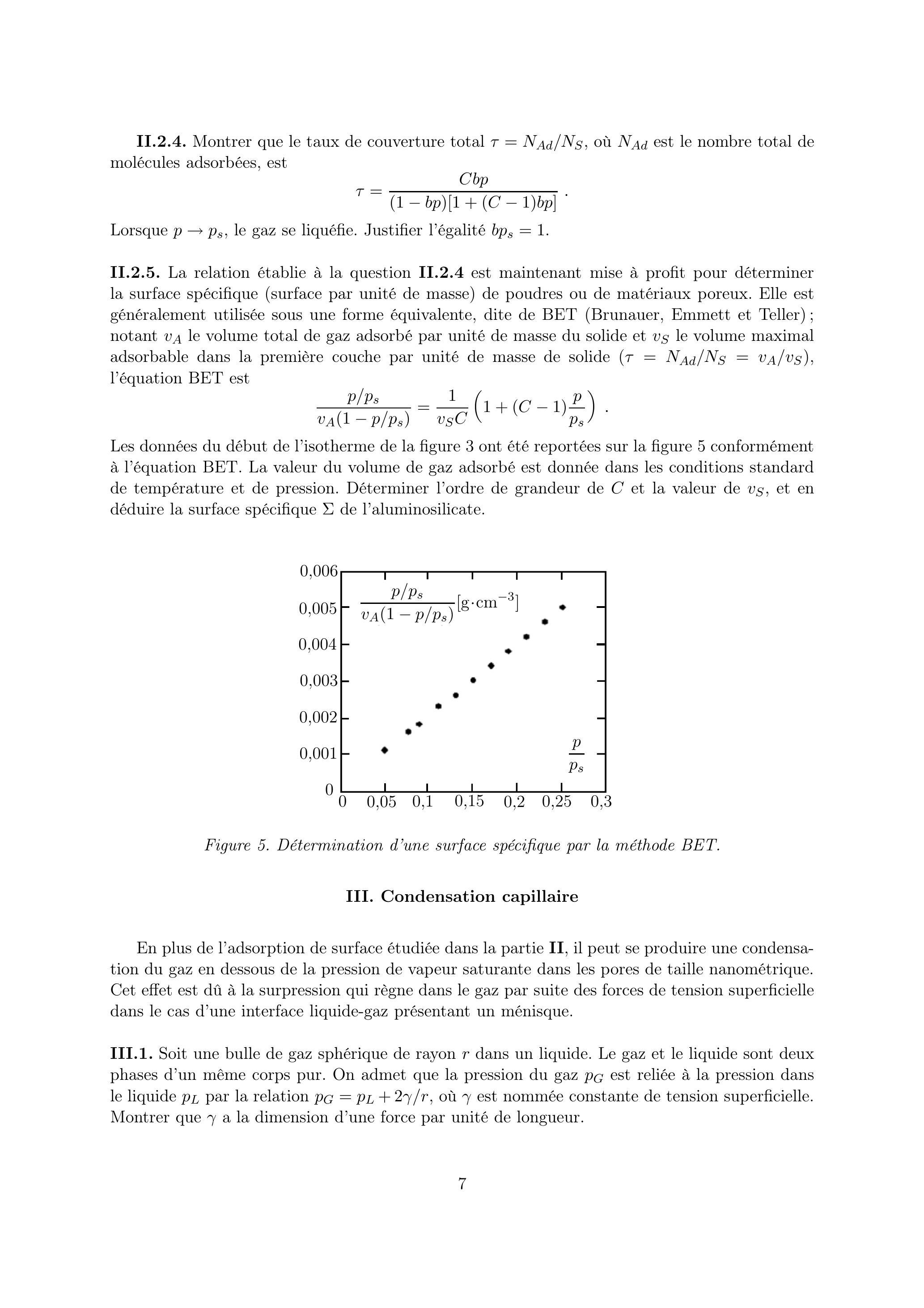 II.2.5. La relation établie à la question II.2.4 est maintenant mise à profit pour déterminer la surface spécifique (surface par unité de masse) de poudres ou de matériaux poreux. Elle est généralement utilisée sous une forme équivalente, dite de BET (Brunauer, Emmett et Teller); notant le volume total de gaz adsorbé par unité de masse du solide et le volume maximal adsorbable dans la première couche par unité de masse de solide ( ), l'équation BET est