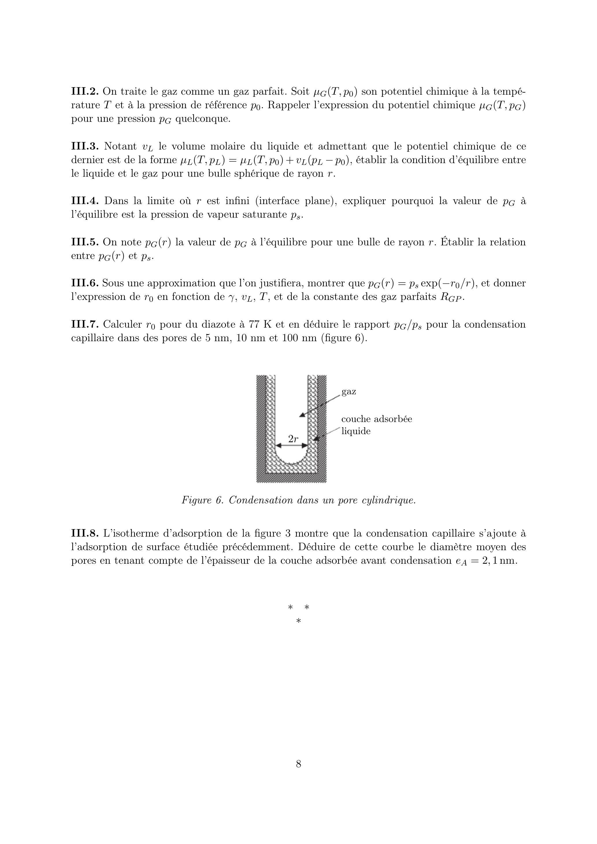III.7. Calculer pour du diazote à 77 K et en déduire le rapport pour la condensation capillaire dans des pores de et 100 nm (figure 6).
