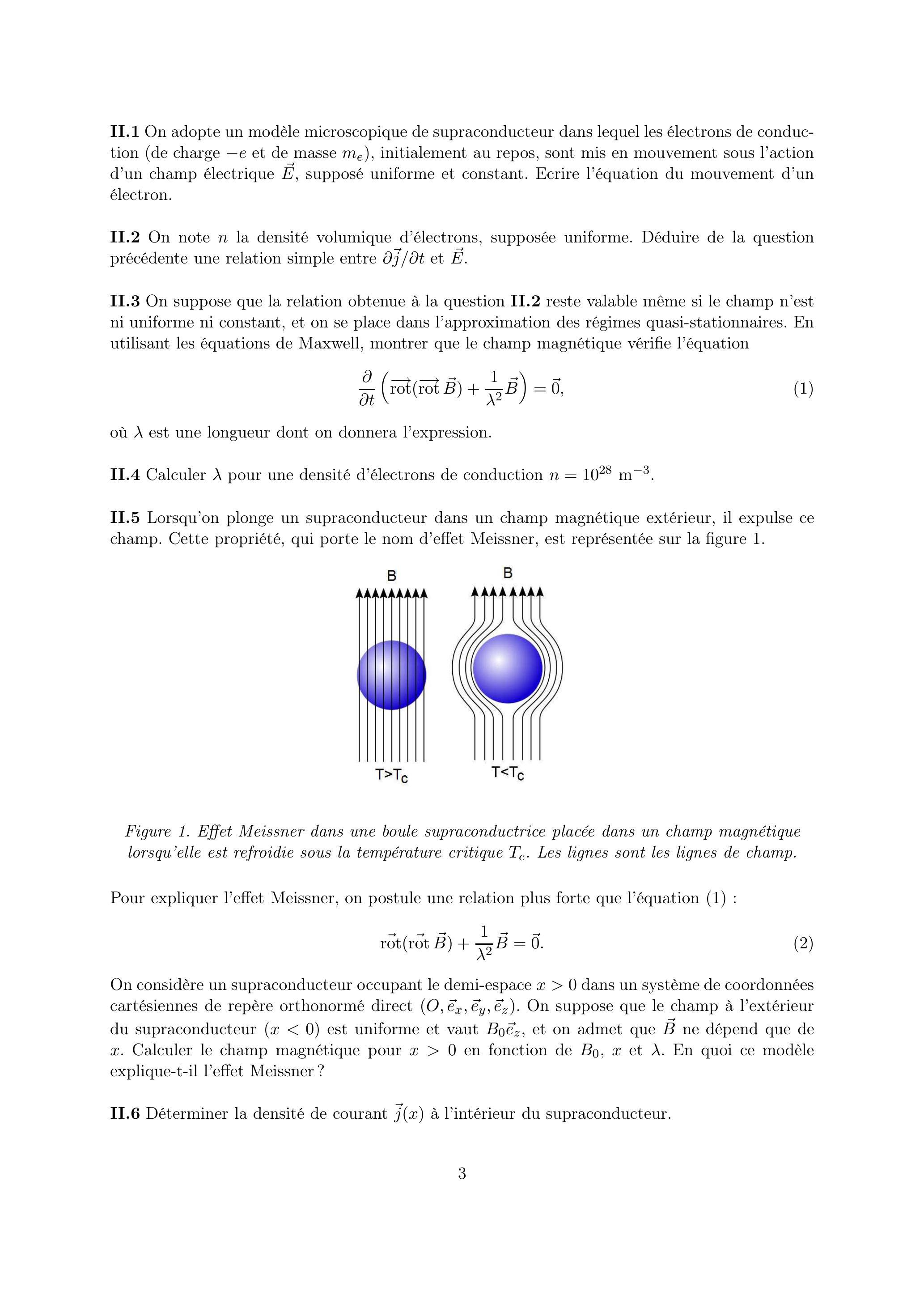II. 1 On adopte un modèle microscopique de supraconducteur dans lequel les électrons de conduction (de charge et de masse ), initialement au repos, sont mis en mouvement sous l'action d'un champ électrique , supposé uniforme et constant. Ecrire l'équation du mouvement d'un électron.