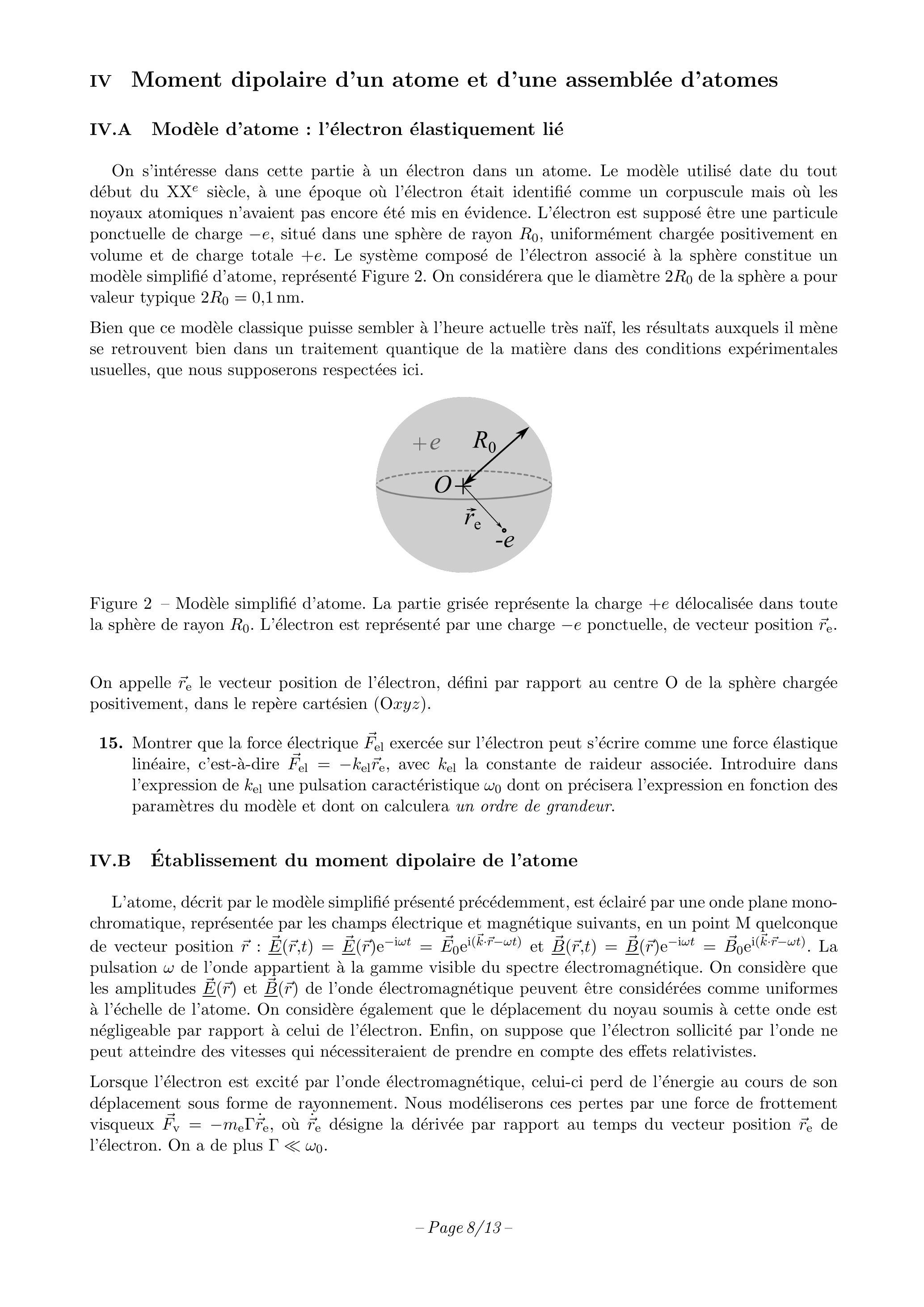 15. Montrer que la force électrique exercée sur l'électron peut s'écrire comme une force élastique linéaire, c'est-à-dire , avec la constante de raideur associée. Introduire dans l'expression de une pulsation caractéristique dont on précisera l'expression en fonction des paramètres du modèle et dont on calculera un ordre de grandeur.