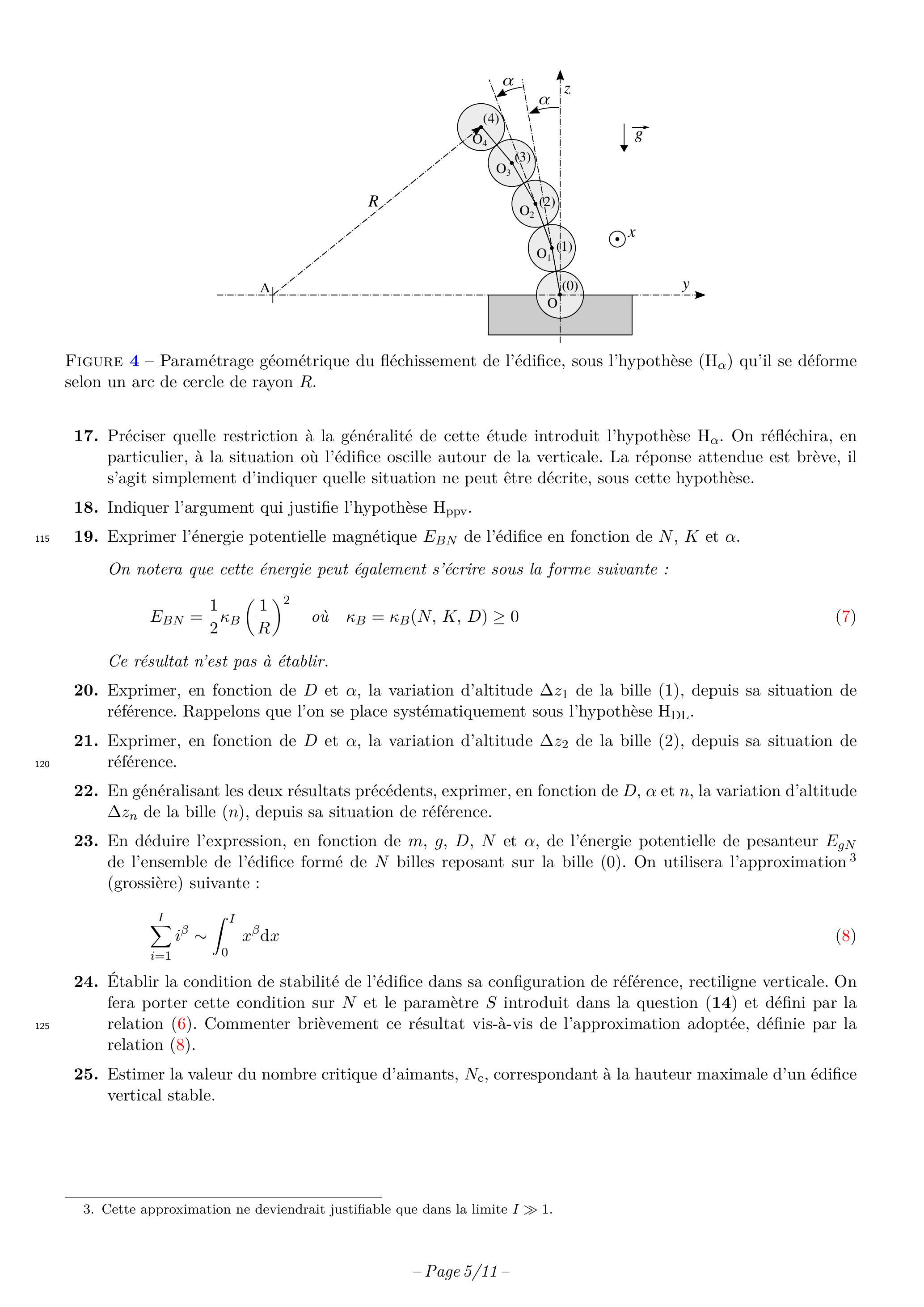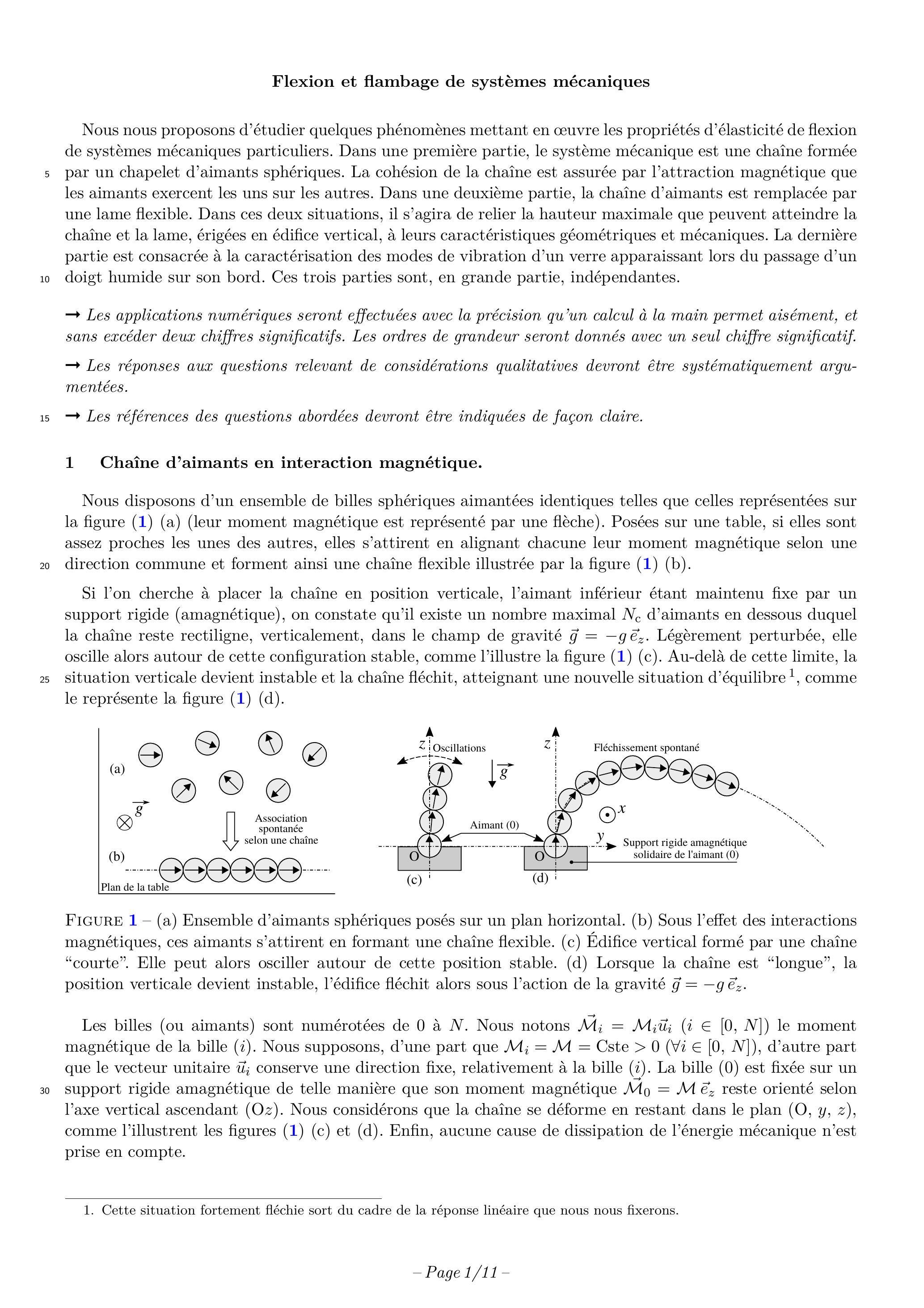 Nous nous proposons d'étudier quelques phénomènes mettant en œuvre les propriétés d'élasticité de flexion de systèmes mécaniques particuliers. Dans une première partie, le système mécanique est une chaîne formée par un chapelet d'aimants sphériques. La cohésion de la chaîne est assurée par l'attraction magnétique que les aimants exercent les uns sur les autres. Dans une deuxième partie, la chaîne d'aimants est remplacée par une lame flexible. Dans ces deux situations, il s'agira de relier la hauteur maximale que peuvent atteindre la chaîne et la lame, érigées en édifice vertical, à leurs caractéristiques géométriques et mécaniques. La dernière partie est consacrée à la caractérisation des modes de vibration d'un verre apparaissant lors du passage d'un doigt humide sur son bord. Ces trois parties sont, en grande partie, indépendantes. Les applications numériques seront effectuées avec la précision qu'un calcul à la main permet aisément, et sans excéder deux chiffres significatifs. Les ordres de grandeur seront donnés avec un seul chiffre significatif. Les réponses aux questions relevant de considérations qualitatives devront être systématiquement argumentées. Les références des questions abordées devront être indiquées de façon claire.
