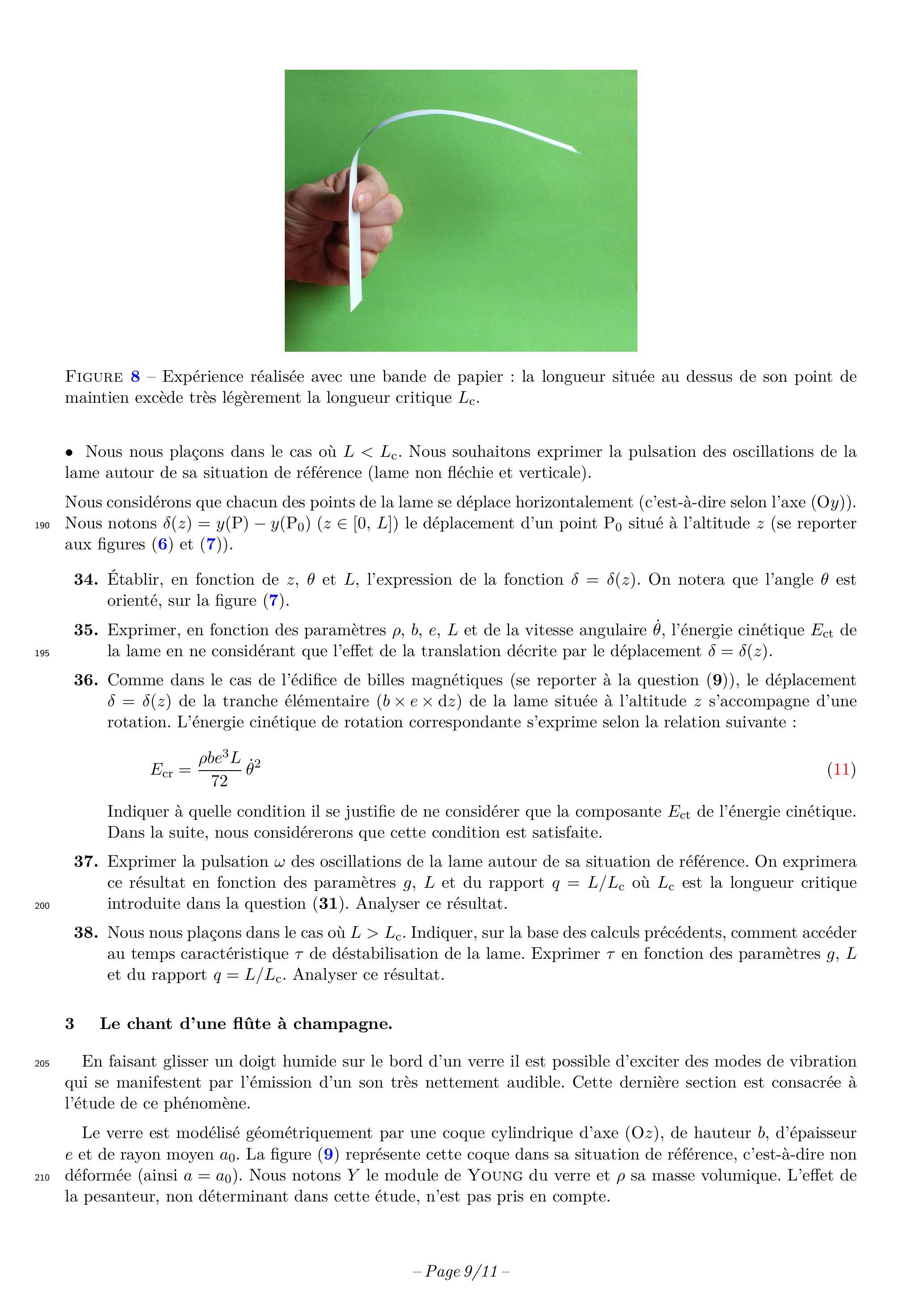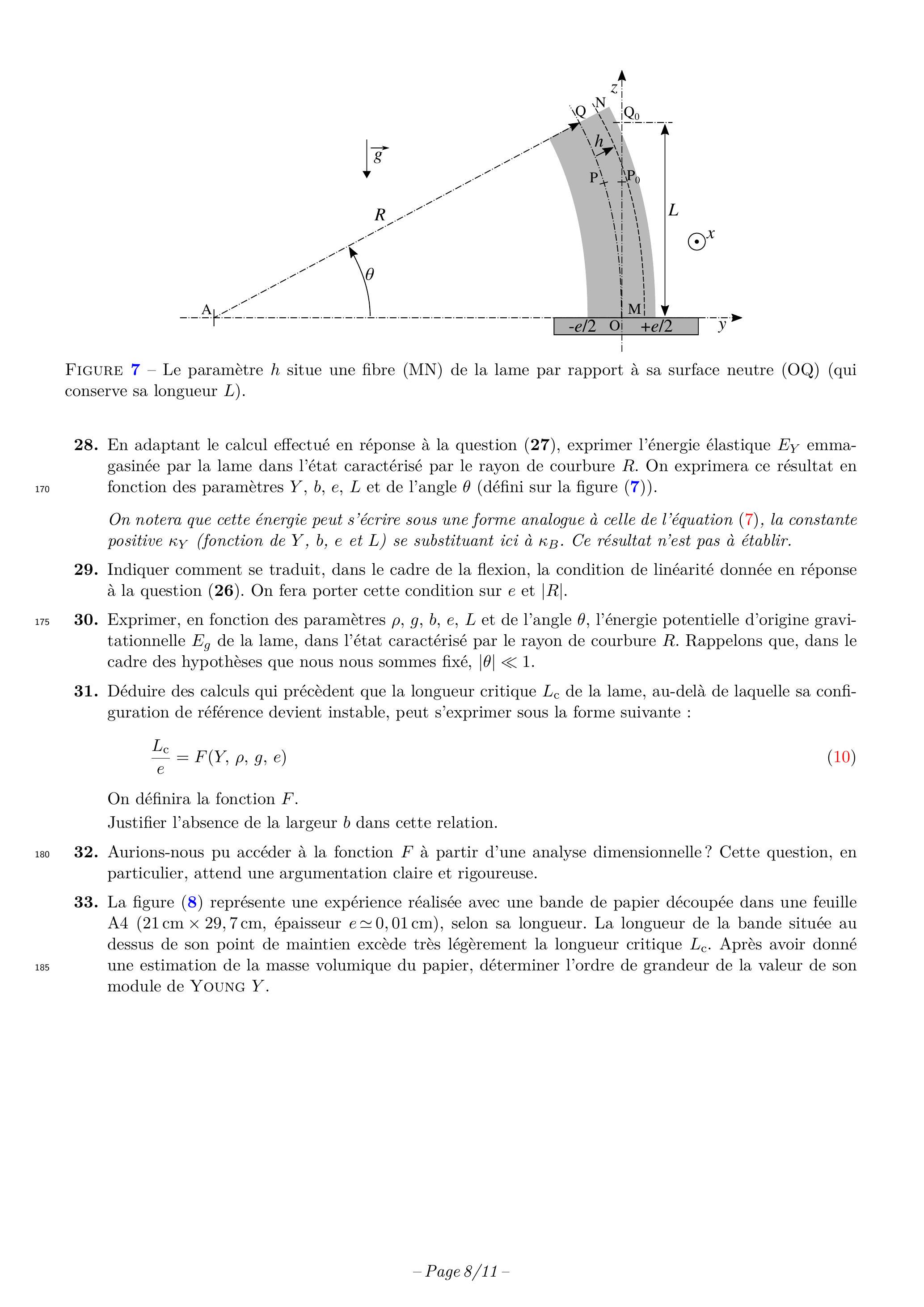 33. La figure (8) représente une expérience réalisée avec une bande de papier découpée dans une feuille A4 ( , épaisseur ), selon sa longueur. La longueur de la bande située au dessus de son point de maintien excède très légèrement la longueur critique . Après avoir donné une estimation de la masse volumique du papier, déterminer l'ordre de grandeur de la valeur de son module de Young .
