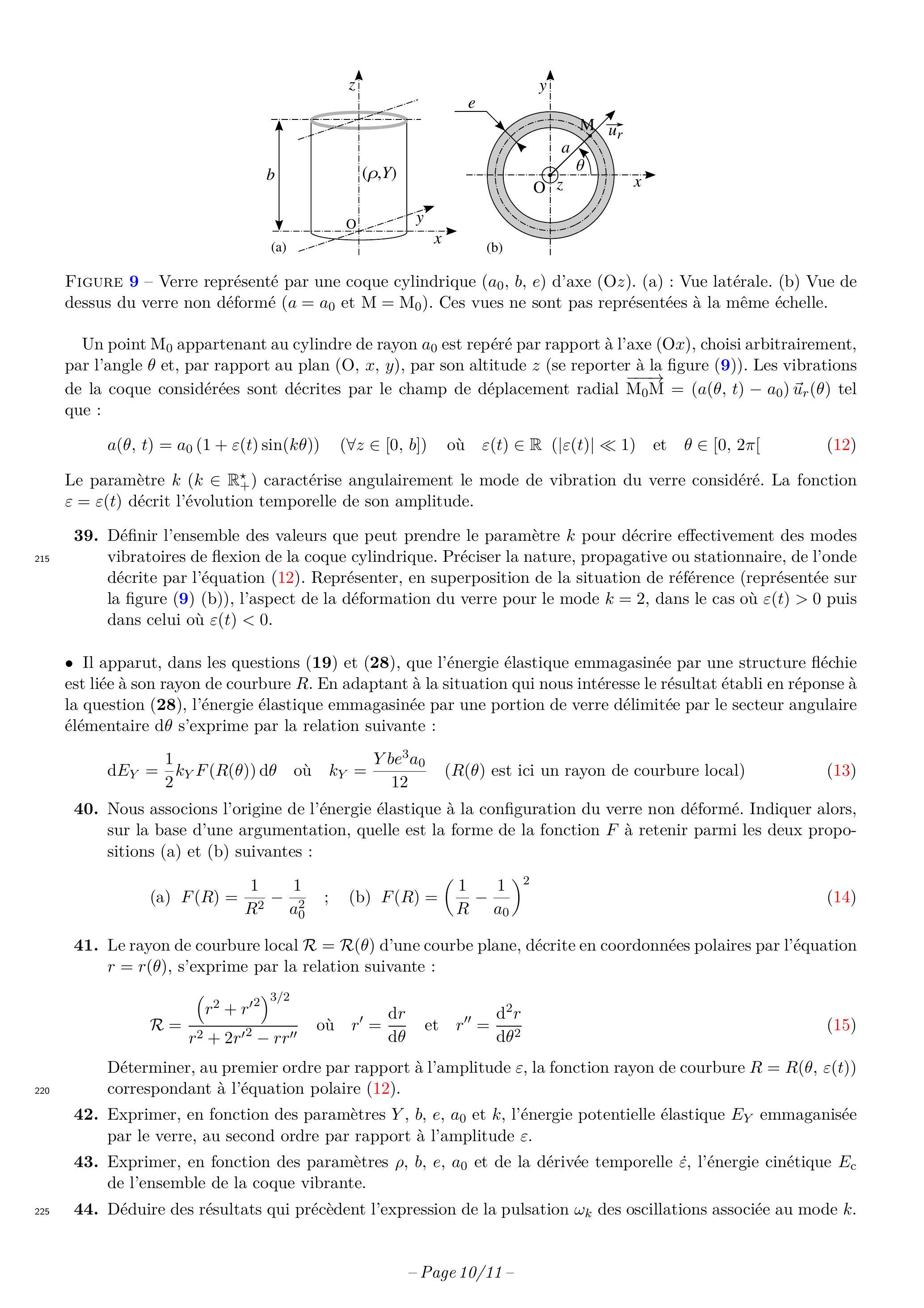 39. Définir l'ensemble des valeurs que peut prendre le paramètre pour décrire effectivement des modes vibratoires de flexion de la coque cylindrique. Préciser la nature, propagative ou stationnaire, de l'onde décrite par l'équation (12). Représenter, en superposition de la situation de référence (représentée sur la figure (9) (b)), l'aspect de la déformation du verre pour le mode , dans le cas où puis dans celui où .