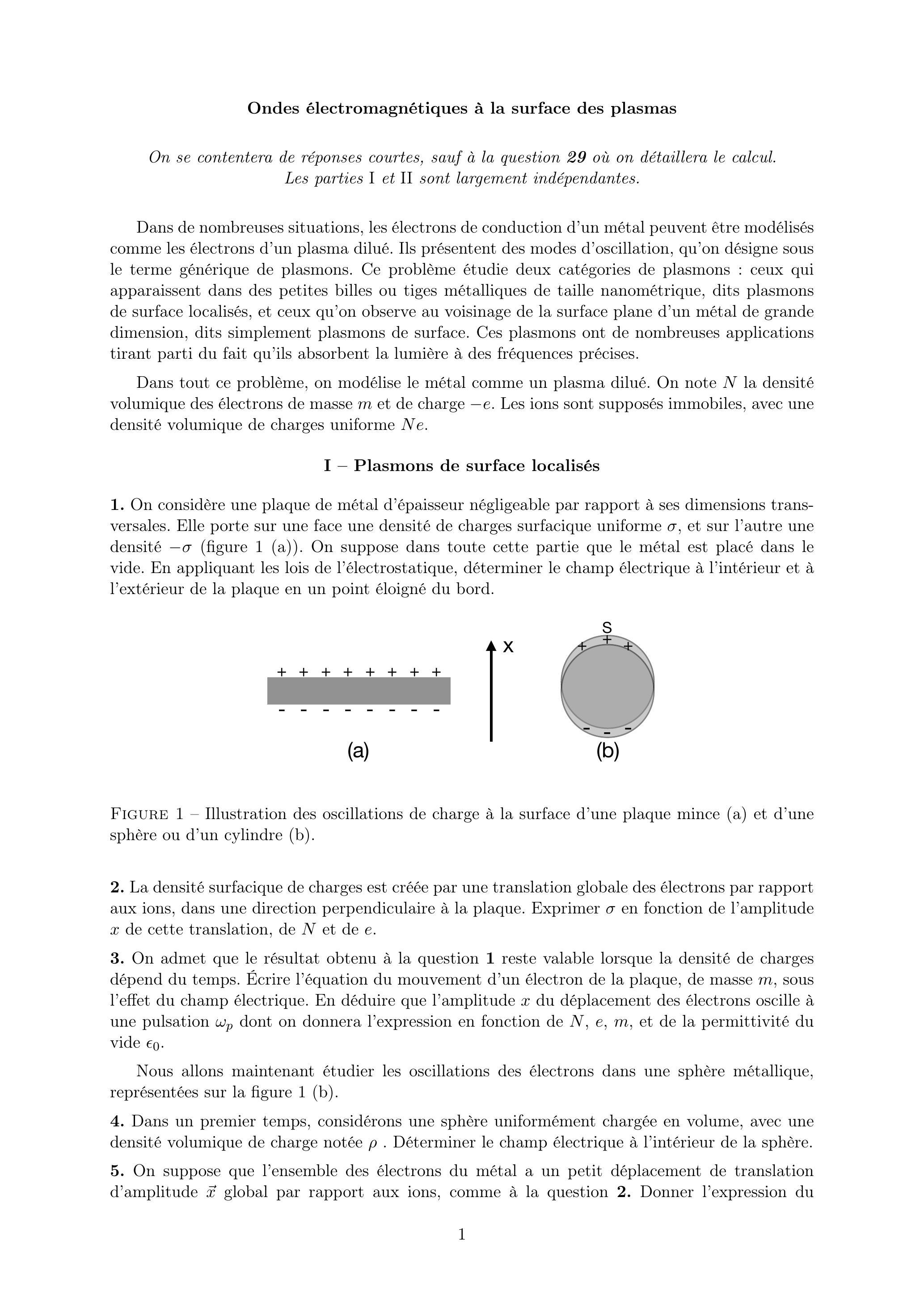 Dans de nombreuses situations, les électrons de conduction d'un métal peuvent être modélisés comme les électrons d'un plasma dilué. Ils présentent des modes d'oscillation, qu'on désigne sous le terme générique de plasmons. Ce problème étudie deux catégories de plasmons : ceux qui apparaissent dans des petites billes ou tiges métalliques de taille nanométrique, dits plasmons de surface localisés, et ceux qu'on observe au voisinage de la surface plane d'un métal de grande dimension, dits simplement plasmons de surface. Ces plasmons ont de nombreuses applications tirant parti du fait qu'ils absorbent la lumière à des fréquences précises.