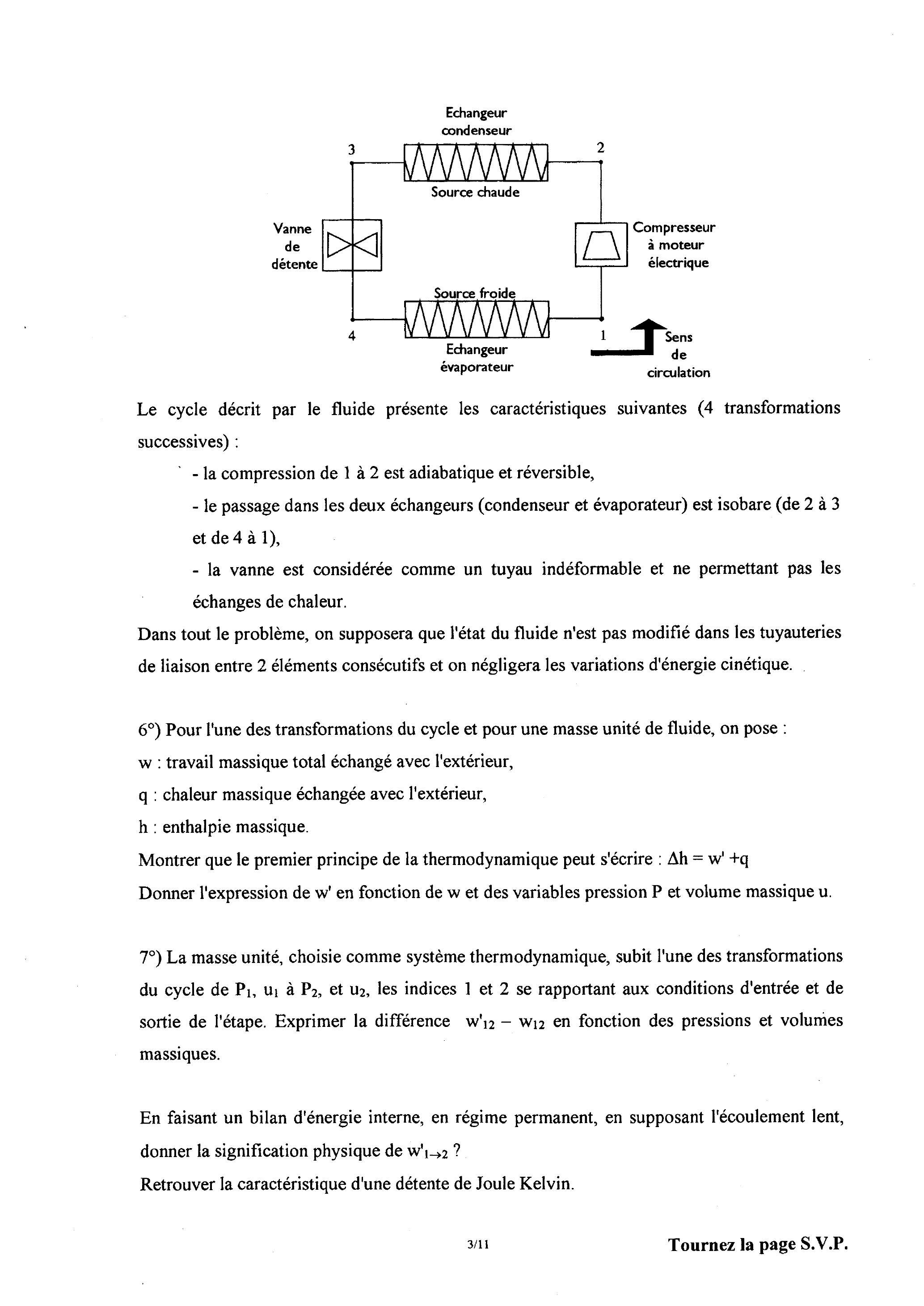 Dans tout le problème, on supposera que l'état du fluide n'est pas modifié dans les tuyauteries de liaison entre 2 éléments consécutifs et on négligera les variations d'énergie cinétique. ) Pour l'une des transformations du cycle et pour une masse unité de fluide, on pose :
