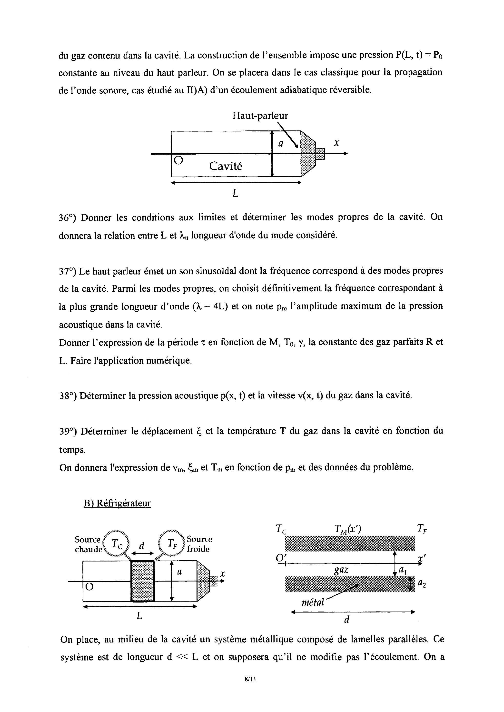 ) Les lamelles métalliques ne sont plus placées au milieu de la cavité, mais à une abscisse . Déterminer, en utilisant les calculs effectués précédemment la puissance thermique développée par le système. Déterminer la position optimale des lamelles métalliques avec . La différence avec le réglage précédent, , est elle importante? ) Soit la masse volumique, la chaleur massique et la conductivité thermique du métal. A l'aide de l'équation de la chaleur, montrer que la propagation d'une onde thermique plane sinusoïdale de pulsation fait intervenir une longueur caractéristique . AN. On prendra pour les applications numérique et . ) Soit la conductivité thermique du gaz. A quelle condition les résultats obtenus sur le métal quand à la propagation d'une onde thermique plane sinusoïdale peuvent-ils s'appliquer au gaz. Déterminer la longueur caractéristique correspondante . AN. ) Evaluer en fonction de la longueur de la cavité L , de la température et des caractéristiques du gaz. ) Evaluer en fonction de et des caractéristiques du gaz et du métal de manière à justifier les hypothèses faites et à obtenir une puissance thermique élevée. ) Faire une synthèse des résultats trouvés en proposant des améliorations réalisables en pratique.