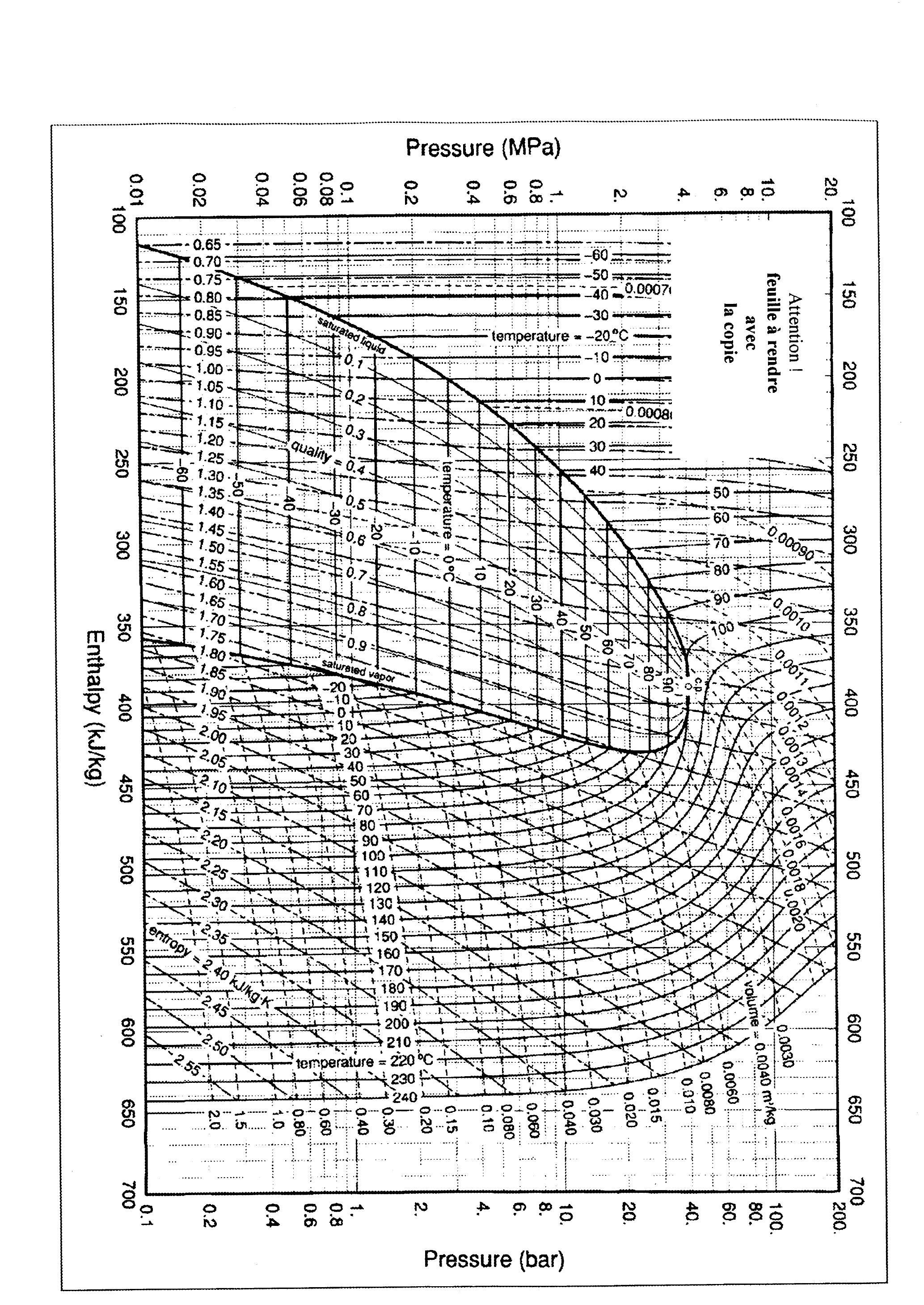 Placer les 4 points du cycle 1,2,3,4 sur le diagramme joint, y représenter le cycle (diagramme à rendre avec la copie) et déterminer, par lecture et interpolation linéaire sur ce même diagramme, les valeurs de en ces différents points. Regrouper les résultats dans un tableau. ) Si le compresseur était adiabatique mais non réversible, comment se situerait sa température de sortie sous la même pression par rapport à la température ? ) Comment peut-on trouver, de deux façons différentes, sur le diagramme la valeur de la chaleur latente massique de vaporisation du fluide à une température T donnée ?