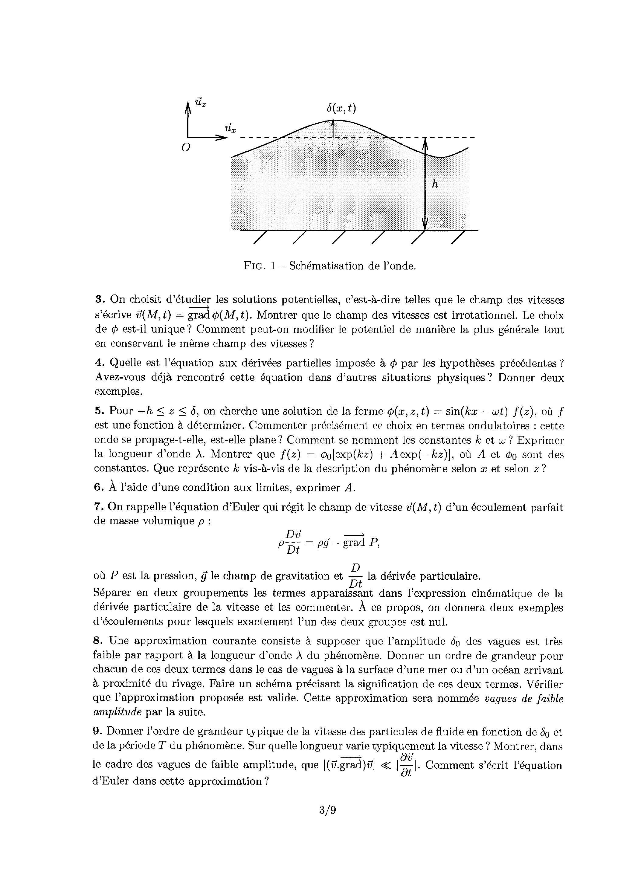 9. Donner l'ordre de grandeur typique de la vitesse des particules de fluide en fonction de et de la période du phénomène. Sur quelle longueur varie typiquement la vitesse? Montrer, dans le cadre des vagues de faible amplitude, que . Comment s'écrit l'équation d'Euler dans cette approximation?