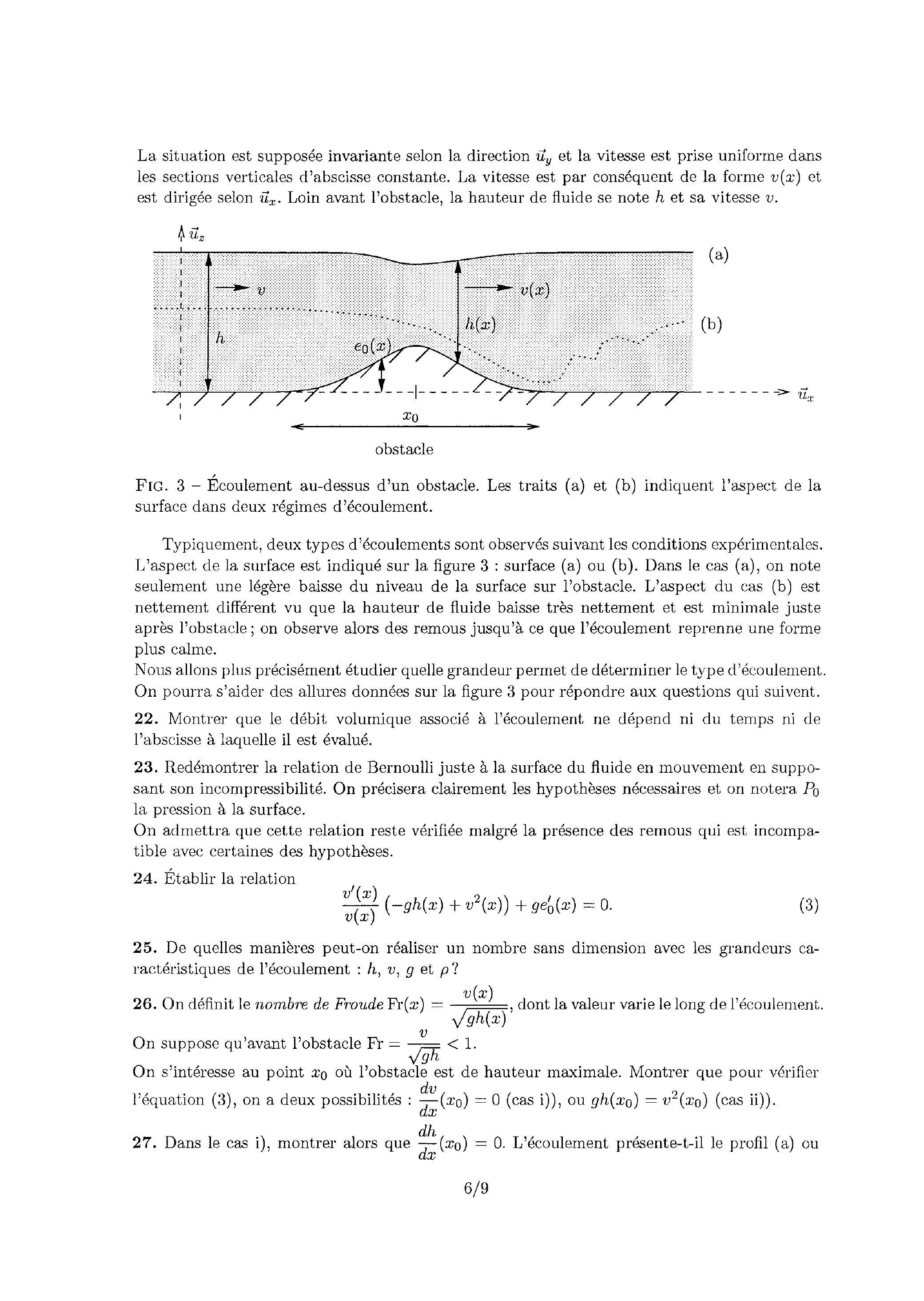 On étudie un écoulement au-dessus d'un obstacle, décrit sur la figure 3 . On appelle la hauteur de l'obstacle par rapport au sol supposé horizontal et la hauteur réelle d'eau.