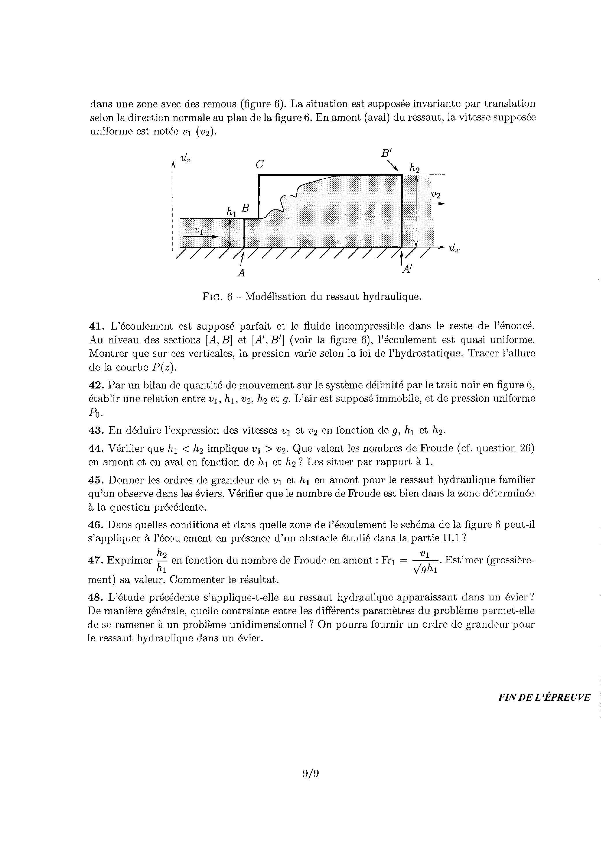 Ce problème étudie quelques situations assez courantes en hydrodynamique. On établit dans la première partie les équations régissant les ondes de gravité dans un fluide, c'est-à-dire, pour prendre un exemple précis, les vagues dans l'eau. On s'intéresse alors sommairement à la manière dont ces vagues sont engendrées par le vent à la surface d'une étendue d'eau. La seconde partie modélise le phénomène de ressaut hydraulique qui se manifeste notamment au fond d'un évier par l'apparition d'un bourrelet circulaire séparant deux zones pour lesquelles la hauteur d'eau diffère notablement. On montrera alors que la vitesse de propagation des vagues joue un rôle essentiel dans l'interprétation du ressaut hydraulique.