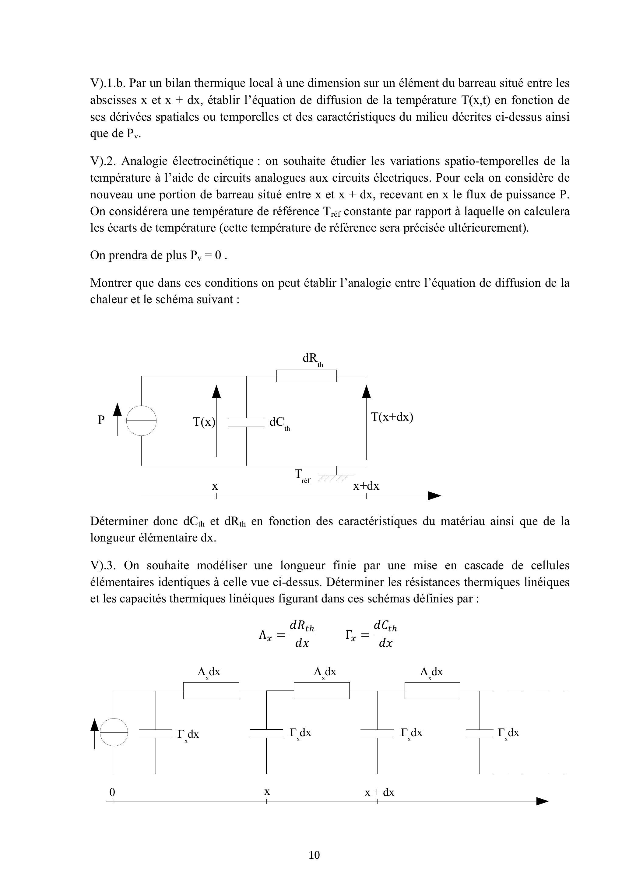 V).2. Analogie électrocinétique : on souhaite étudier les variations spatio-temporelles de la température à l'aide de circuits analogues aux circuits électriques. Pour cela on considère de nouveau une portion de barreau situé entre x et , recevant en x le flux de puissance P . On considérera une température de référence constante par rapport à laquelle on calculera les écarts de température (cette température de référence sera précisée ultérieurement).