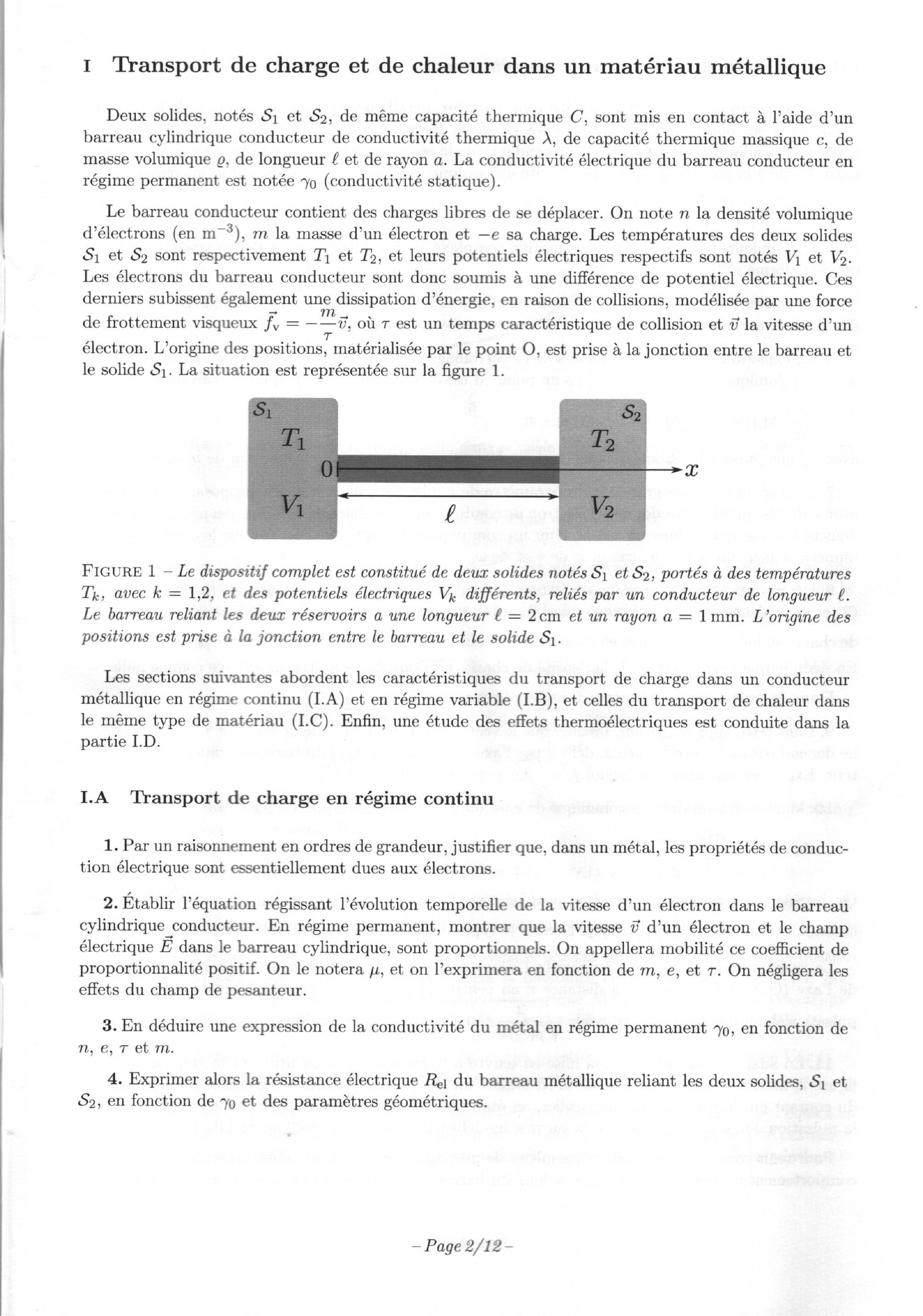 Le barreau conducteur contient des charges libres de se déplacer. On note la densité volumique d'électrons (en ), la masse d'un électron et sa charge. Les températures des deux solides et sont respectivement et , et leurs potentiels électriques respectifs sont notés et . Les électrons du barreau conducteur sont donc soumis à une différence de potentiel électrique. Ces derniers subissent également une dissipation d'énergie, en raison de collisions, modélisée par une force de frottement visqueux , où est un temps caractéristique de collision et la vitesse d'un électron. L'origine des positions, matérialisée par le point O , est prise à la jonction entre le barreau et le solide . La situation est représentée sur la figure 1 .