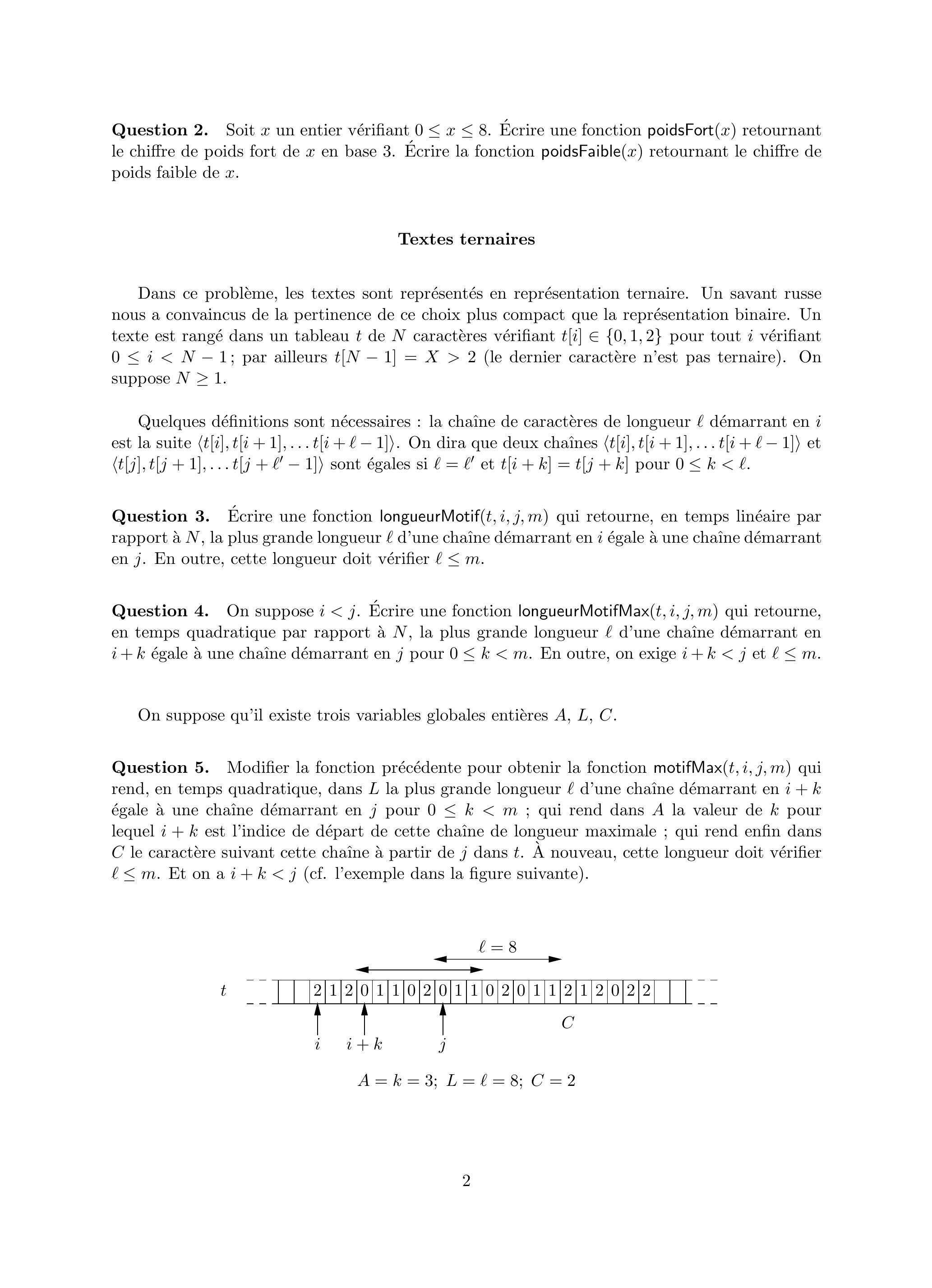 Dans ce problème, les textes sont représentés en représentation ternaire. Un savant russe nous a convaincus de la pertinence de ce choix plus compact que la représentation binaire. Un texte est rangé dans un tableau de caractères vérifiant pour tout vérifiant ; par ailleurs (le dernier caractère n'est pas ternaire). On suppose .