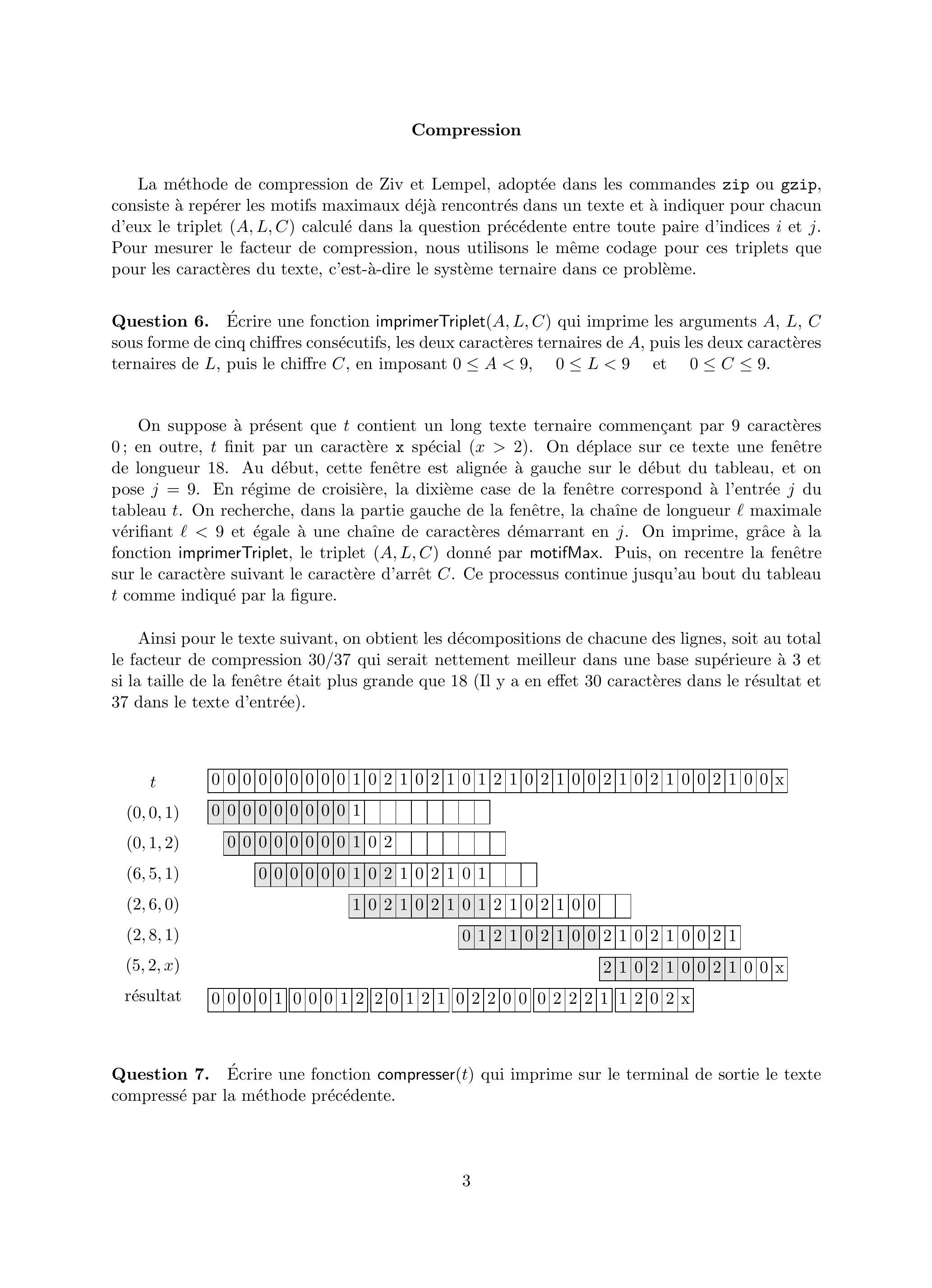 La méthode de compression de Ziv et Lempel, adoptée dans les commandes zip ou gzip, consiste à repérer les motifs maximaux déjà rencontrés dans un texte et à indiquer pour chacun d'eux le triplet ( ) calculé dans la question précédente entre toute paire d'indices et . Pour mesurer le facteur de compression, nous utilisons le même codage pour ces triplets que pour les caractères du texte, c'est-à-dire le système ternaire dans ce problème.