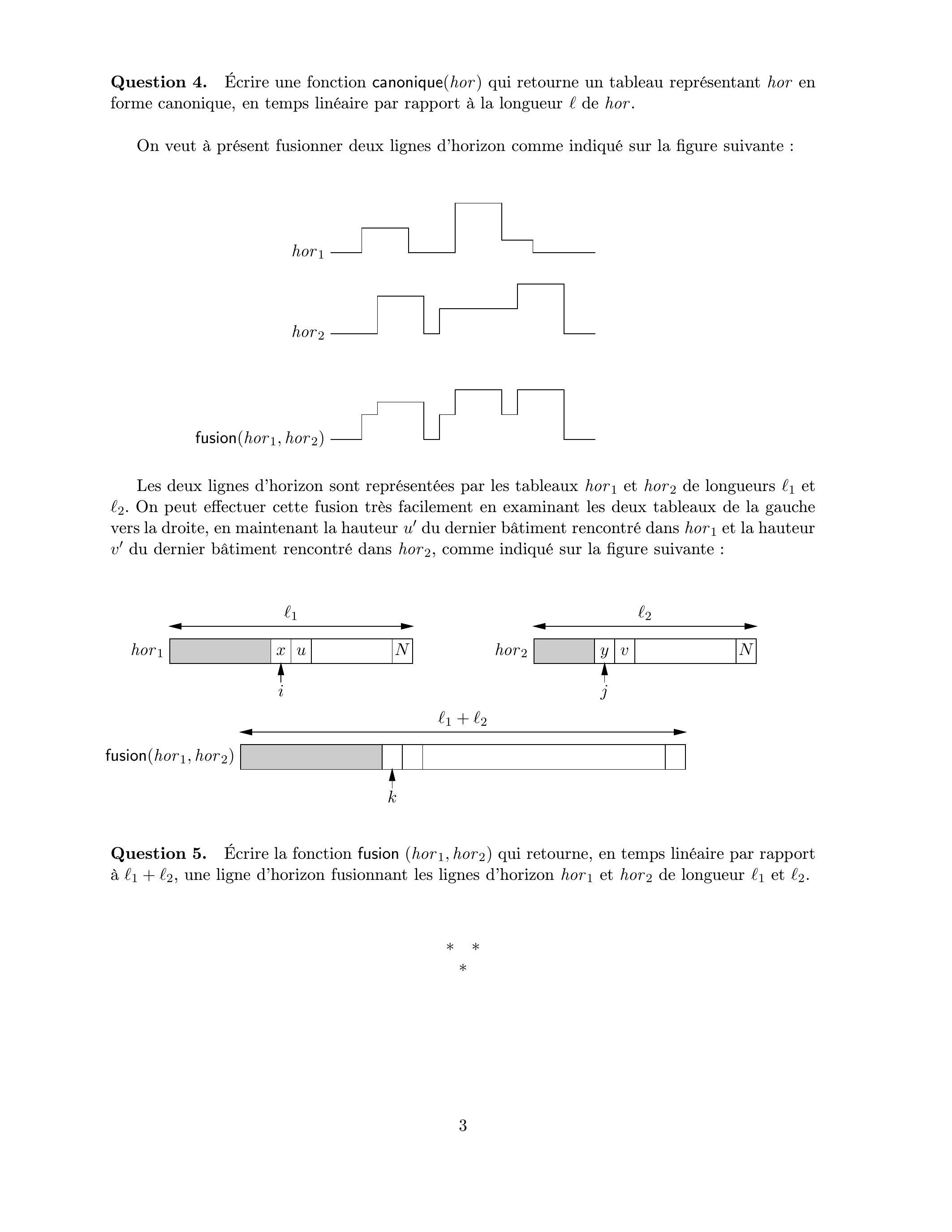 Question 5. Écrire la fonction fusion qui retourne, en temps linéaire par rapport à , une ligne d'horizon fusionnant les lignes d'horizon et de longueur et .