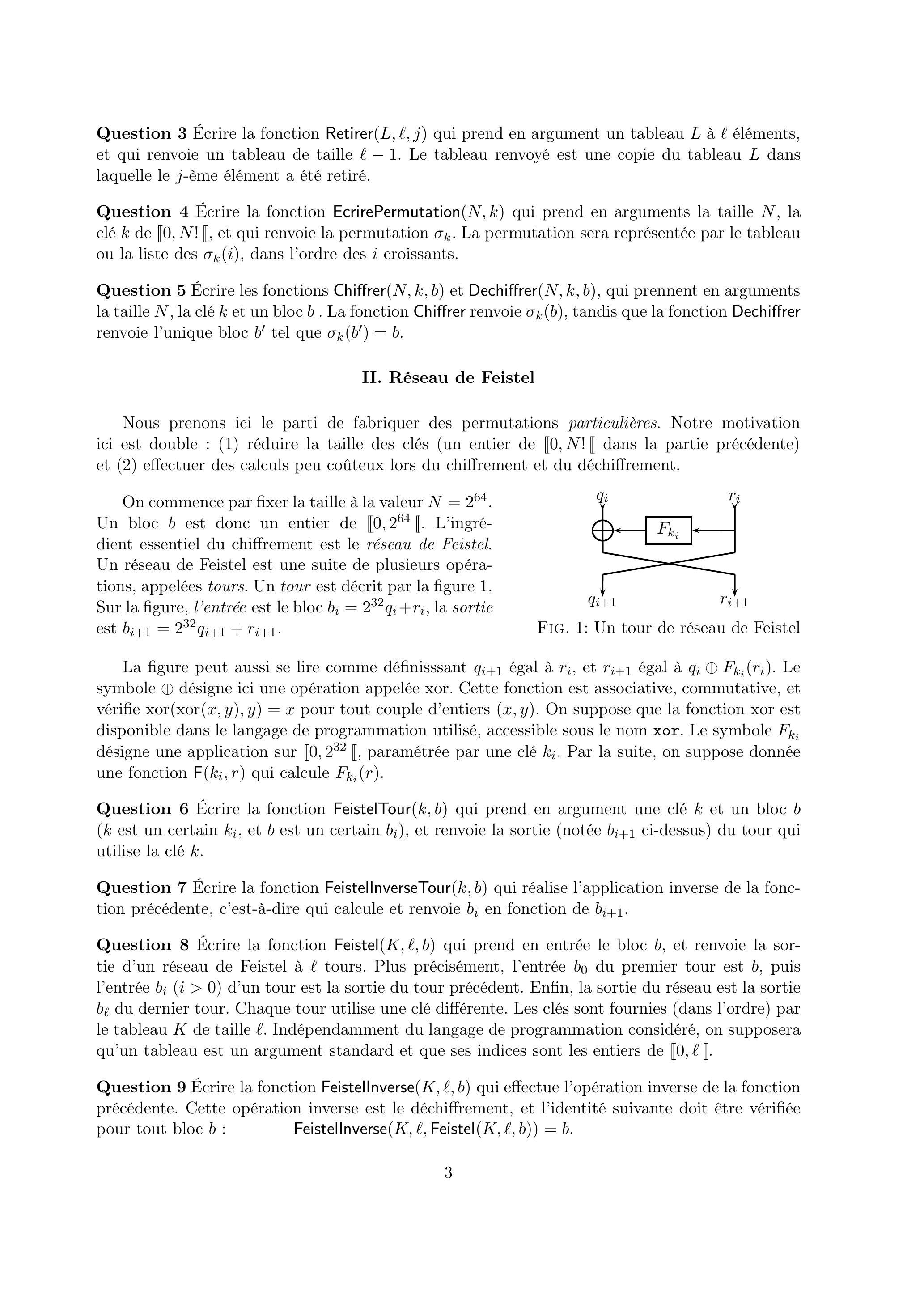 Question 8 Écrire la fonction Feistel ( ) qui prend en entrée le bloc , et renvoie la sortie d'un réseau de Feistel à tours. Plus précisément, l'entrée du premier tour est , puis l'entrée d'un tour est la sortie du tour précédent. Enfin, la sortie du réseau est la sortie du dernier tour. Chaque tour utilise une clé différente. Les clés sont fournies (dans l'ordre) par le tableau de taille . Indépendamment du langage de programmation considéré, on supposera qu'un tableau est un argument standard et que ses indices sont les entiers de .