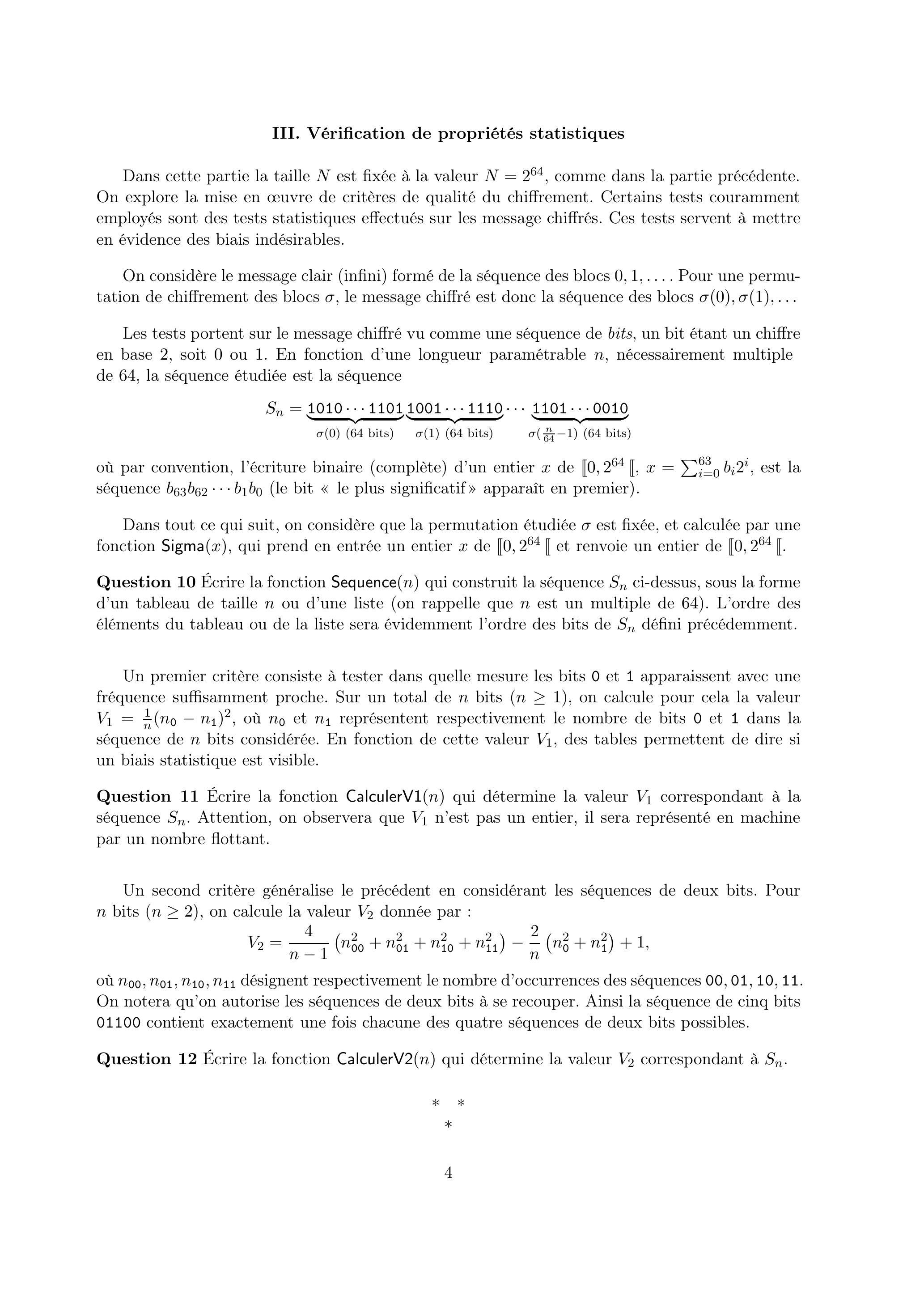 Dans cette partie la taille est fixée à la valeur , comme dans la partie précédente. On explore la mise en œuvre de critères de qualité du chiffrement. Certains tests couramment employés sont des tests statistiques effectués sur les message chiffrés. Ces tests servent à mettre en évidence des biais indésirables.