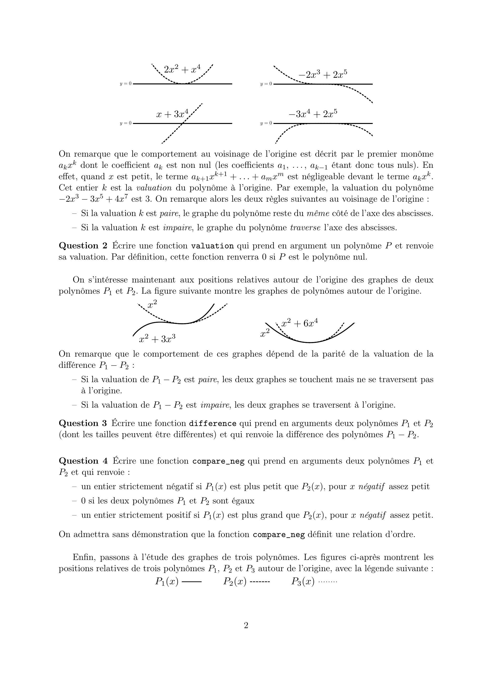 Dans tout le problème, les polynômes sont représentés par des tableaux de nombres flottants de la forme . Le nombre peut être nul, par conséquent un polynôme donné admet plusieurs représentations sous forme de tableau. Ces tableaux sont indexés à partir de 1 et les éléments d'un tableau de taille sont donc indexés de 1 à . On suppose qu'il existe également une primitive allouer( ) pour créer un tableau de cases. La taille d'un tableau est renvoyée par la primitive taille . L'accès à la case d'un tableau est noté . Par ailleurs, on suppose que les tableaux peuvent être passés en argument ou renvoyés comme résultat de fonction, quel que soit le langage utilisé par le candidat pour composer. Enfin, les booléens vrai et faux sont utilisés dans certaines questions de ce problème. Le candidat est libre d'utiliser les notations propres à ces booléens dans le langage dans lequel il compose.