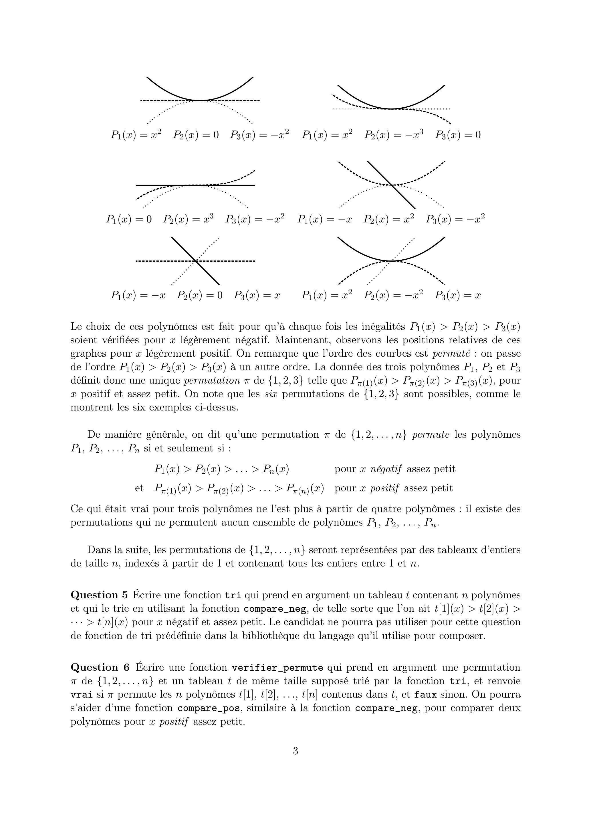 Question 6 Écrire une fonction verifier_permute qui prend en argument une permutation de et un tableau de même taille supposé trié par la fonction tri, et renvoie vrai si permute les polynômes contenus dans , et faux sinon. On pourra s'aider d'une fonction compare_pos, similaire à la fonction compare_neg, pour comparer deux polynômes pour positif assez petit.