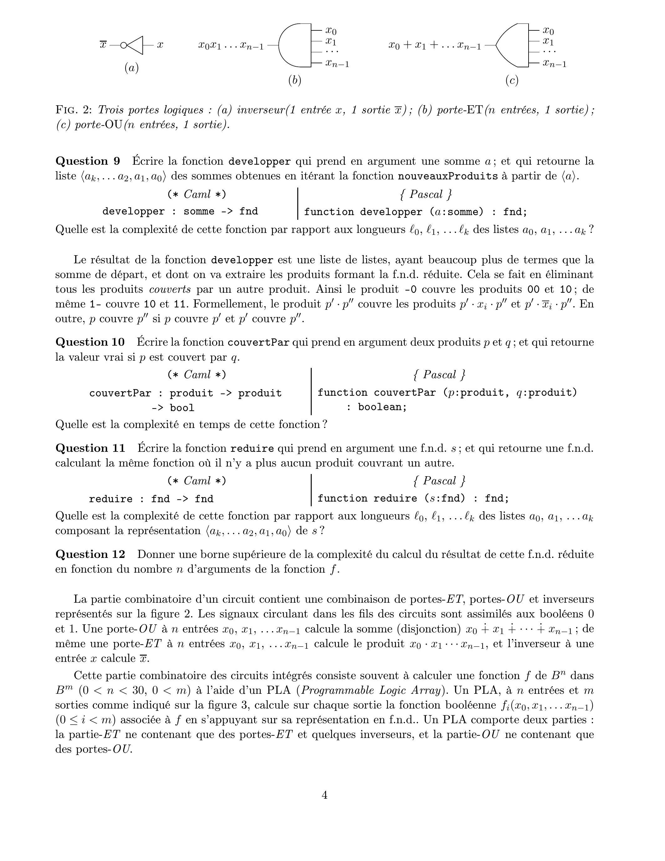 La partie combinatoire d'un circuit contient une combinaison de portes- , portes- et inverseurs représentés sur la figure 2 . Les signaux circulant dans les fils des circuits sont assimilés aux booléens 0 et 1 . Une porte- à entrées calcule la somme (disjonction) ; de même une porte- à entrées calcule le produit , et l'inverseur à une entrée calcule .