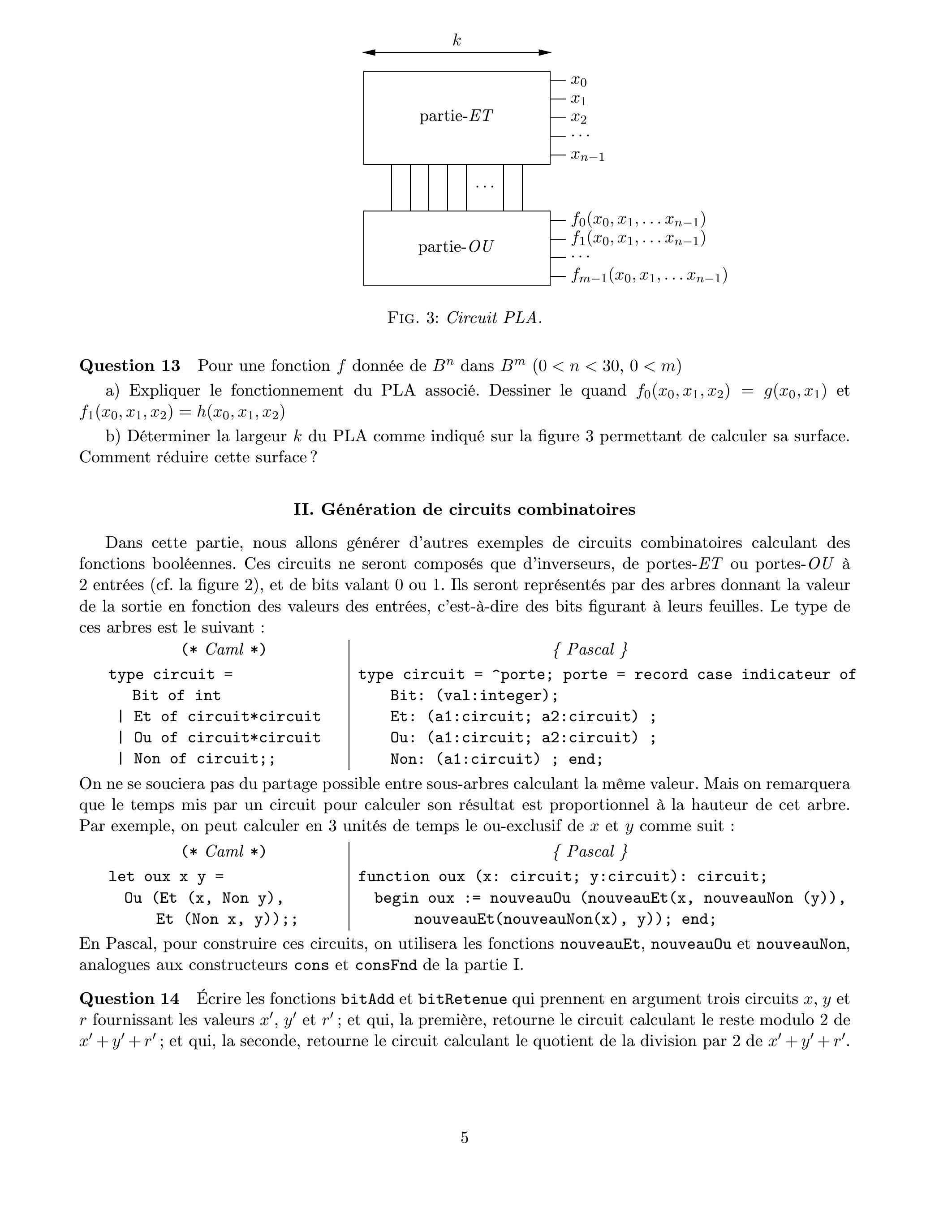 Cette partie combinatoire des circuits intégrés consiste souvent à calculer une fonction de dans à l'aide d'un PLA (Programmable Logic Array). Un PLA, à entrées et sorties comme indiqué sur la figure 3 , calcule sur chaque sortie la fonction booléenne associée à en s'appuyant sur sa représentation en f.n.d.. Un PLA comporte deux parties : la partie- ne contenant que des portes- et quelques inverseurs, et la partie- ne contenant que des portes-OU.