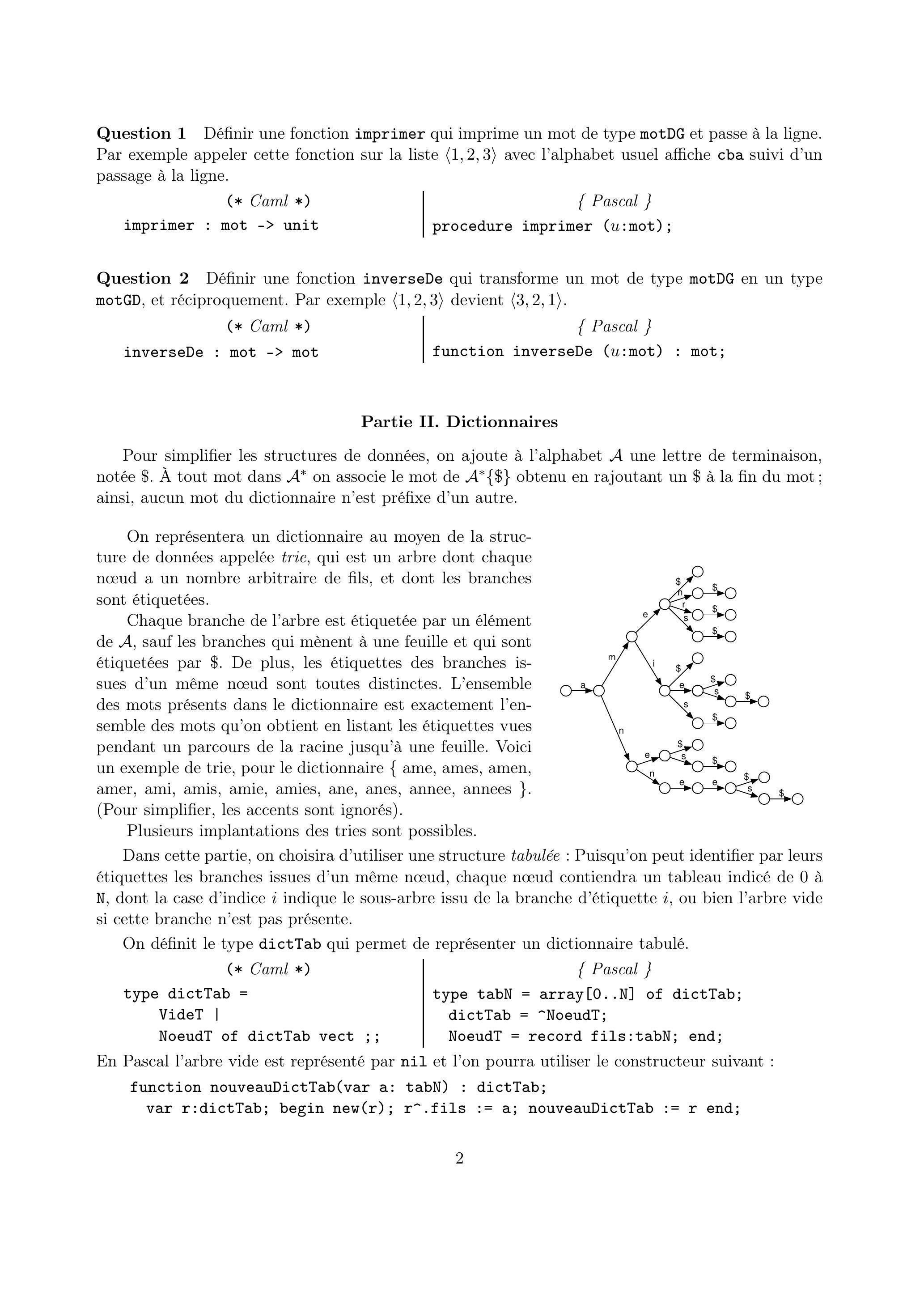 La première partie de ce problème introduit la structure de données permettant de représenter des mots. Les trois parties suivantes étudient une structure de données permettant de représenter de façon efficace un dictionnaire par partage de préfixes. Cette structure de données s'appelle trie et deux façons de l'implanter sont proposées. La cinquième partie résout la recherche du mot le plus long. La sixième et dernière partie s'intéresse à la recherche d'anagrammes.