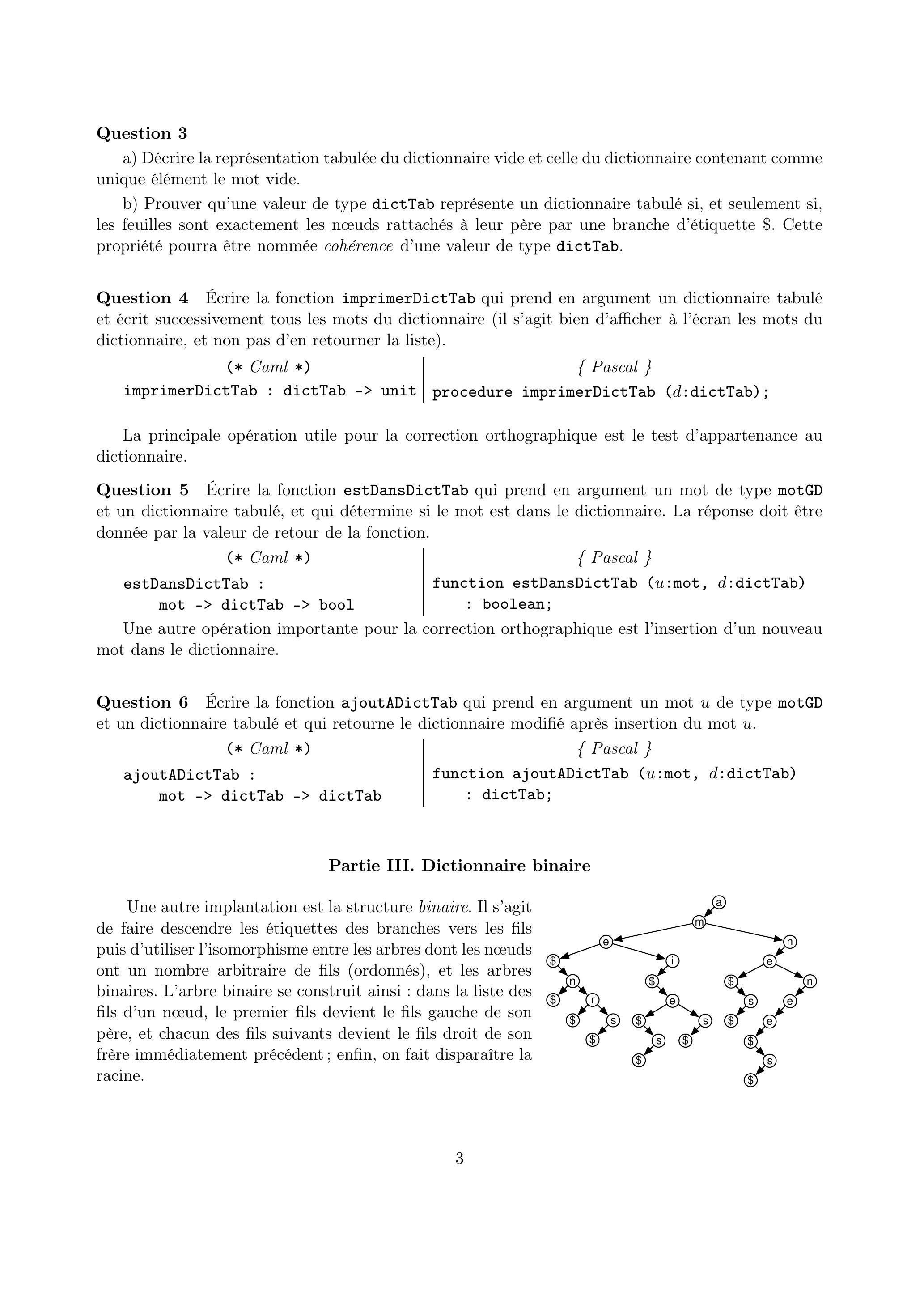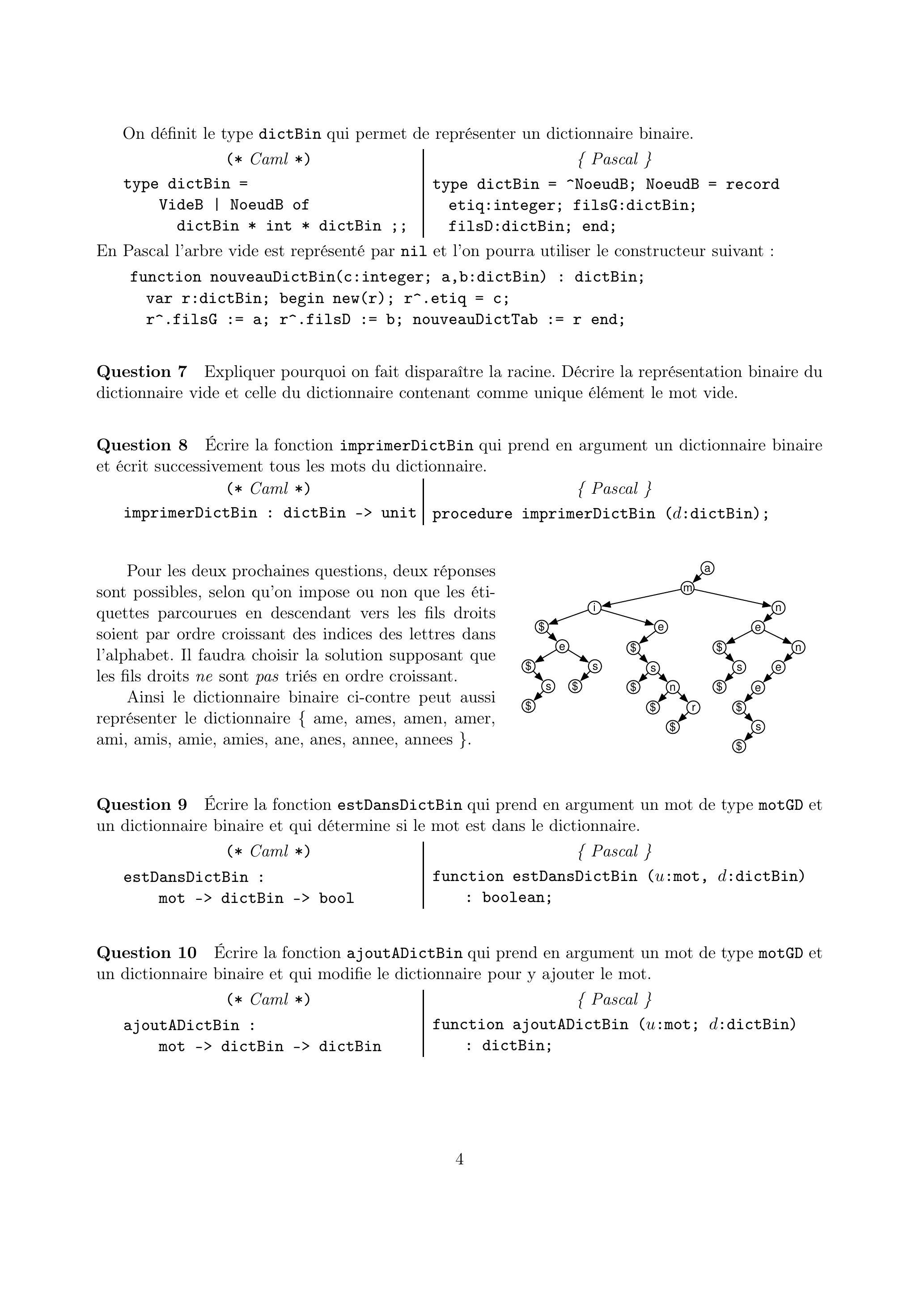 Question 7 Expliquer pourquoi on fait disparaître la racine. Décrire la représentation binaire du dictionnaire vide et celle du dictionnaire contenant comme unique élément le mot vide.