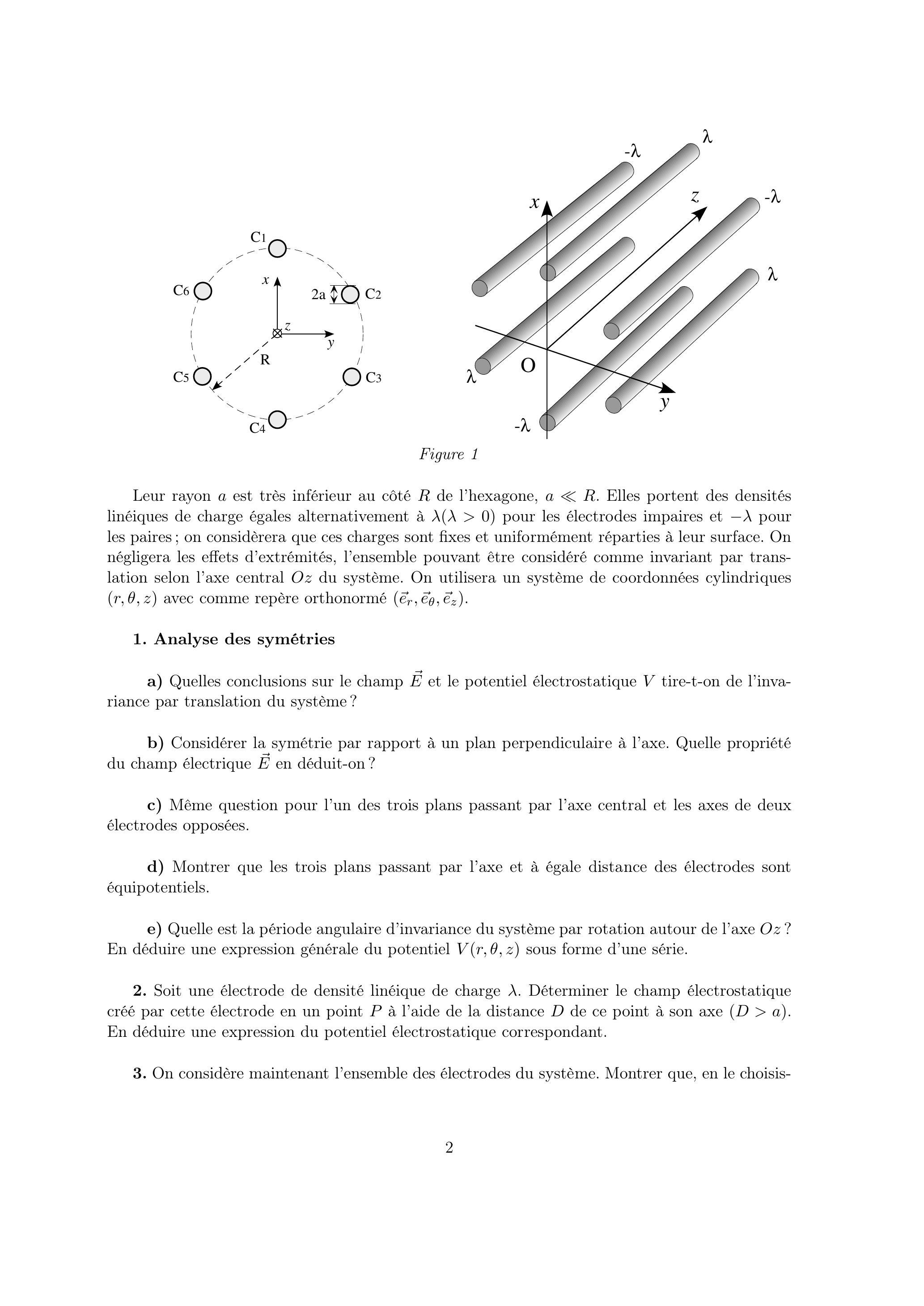 Leur rayon est très inférieur au côté de l'hexagone, . Elles portent des densités linéiques de charge égales alternativement à pour les électrodes impaires et pour les paires; on considèrera que ces charges sont fixes et uniformément réparties à leur surface. On négligera les effets d'extrémités, l'ensemble pouvant être considéré comme invariant par translation selon l'axe central du système. On utilisera un système de coordonnées cylindriques ( ) avec comme repère orthonormé ( ).