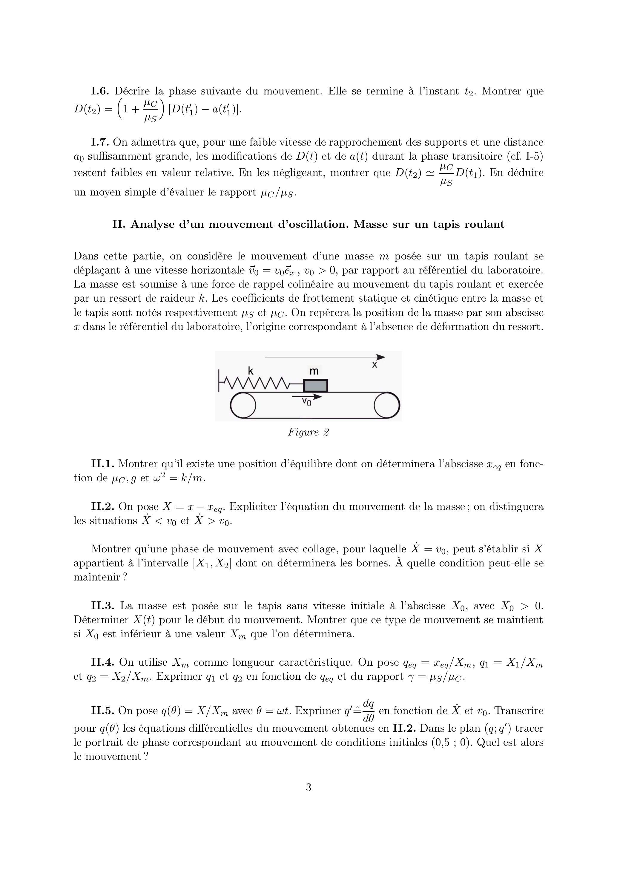 II.3. La masse est posée sur le tapis sans vitesse initiale à l'abscisse , avec . Déterminer pour le début du mouvement. Montrer que ce type de mouvement se maintient si est inférieur à une valeur que l'on déterminera.