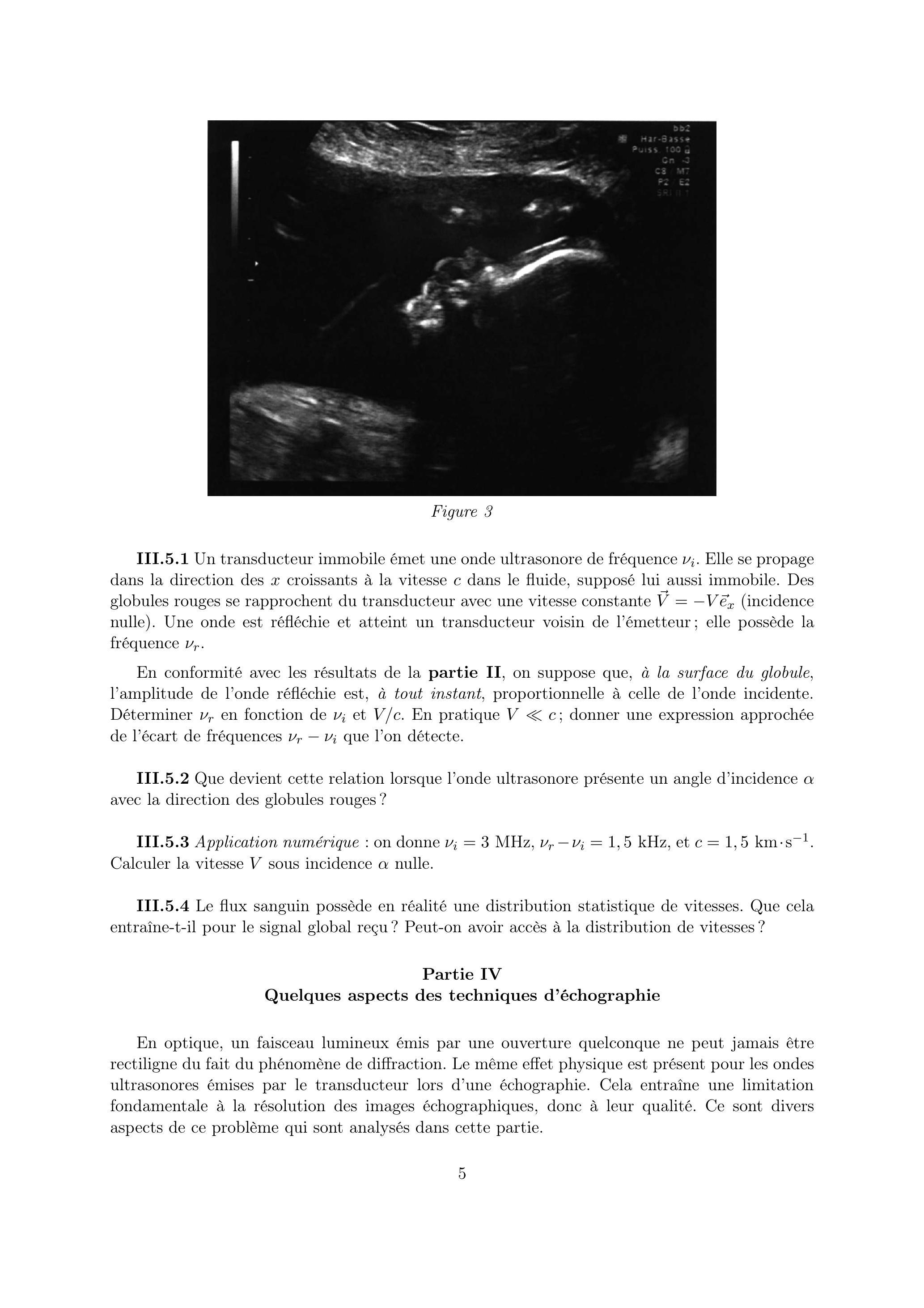 III. 5 Une utilisation importante des ondes ultrasonores en échographie concerne l'échographie doppler, qui combine la technique échographique avec l'effet doppler. Ainsi, lorsque des globules rouges réfléchissent une onde ultrasonore, les fréquences des ondes réfléchies sont différentes de celle de l'onde incidente du fait de la vitesse non nulle du flux sanguin. De la mesure de ces fréquences, on peut déduire cette vitesse.