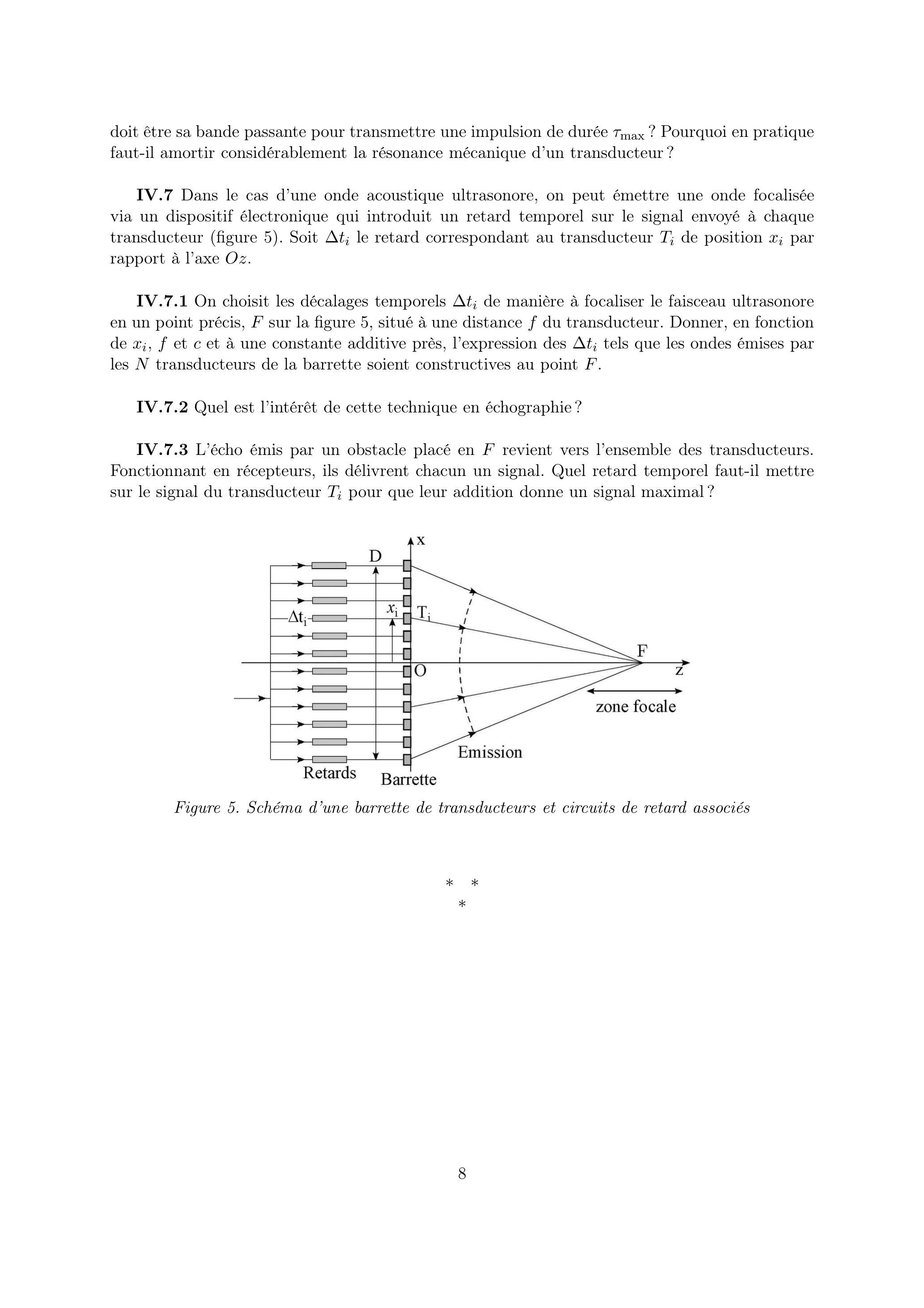 IV.7.1 On choisit les décalages temporels de manière à focaliser le faisceau ultrasonore en un point précis, sur la figure 5 , situé à une distance du transducteur. Donner, en fonction de et et à une constante additive près, l'expression des tels que les ondes émises par les transducteurs de la barrette soient constructives au point .