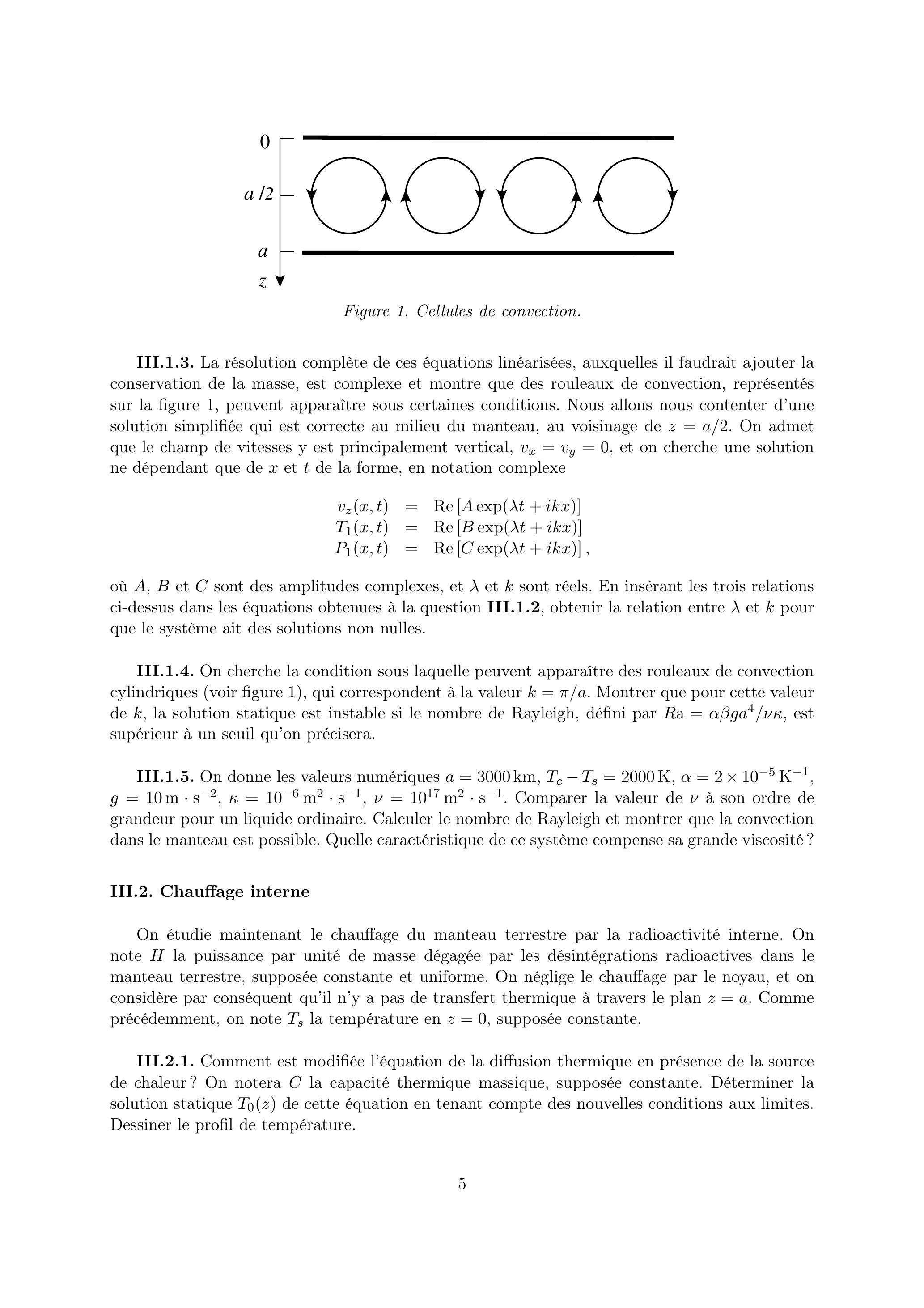 Dans cette partie, on se propose de modéliser le phénomène de convection dans le manteau terrestre. On modélise celui-ci comme un fluide contenu entre les plans et . Comme dans la partie précédente, désigne la profondeur comptée à partir de la surface. Le champ de vitesses eulérien du fluide satisfait l'équation de Navier-Stokes