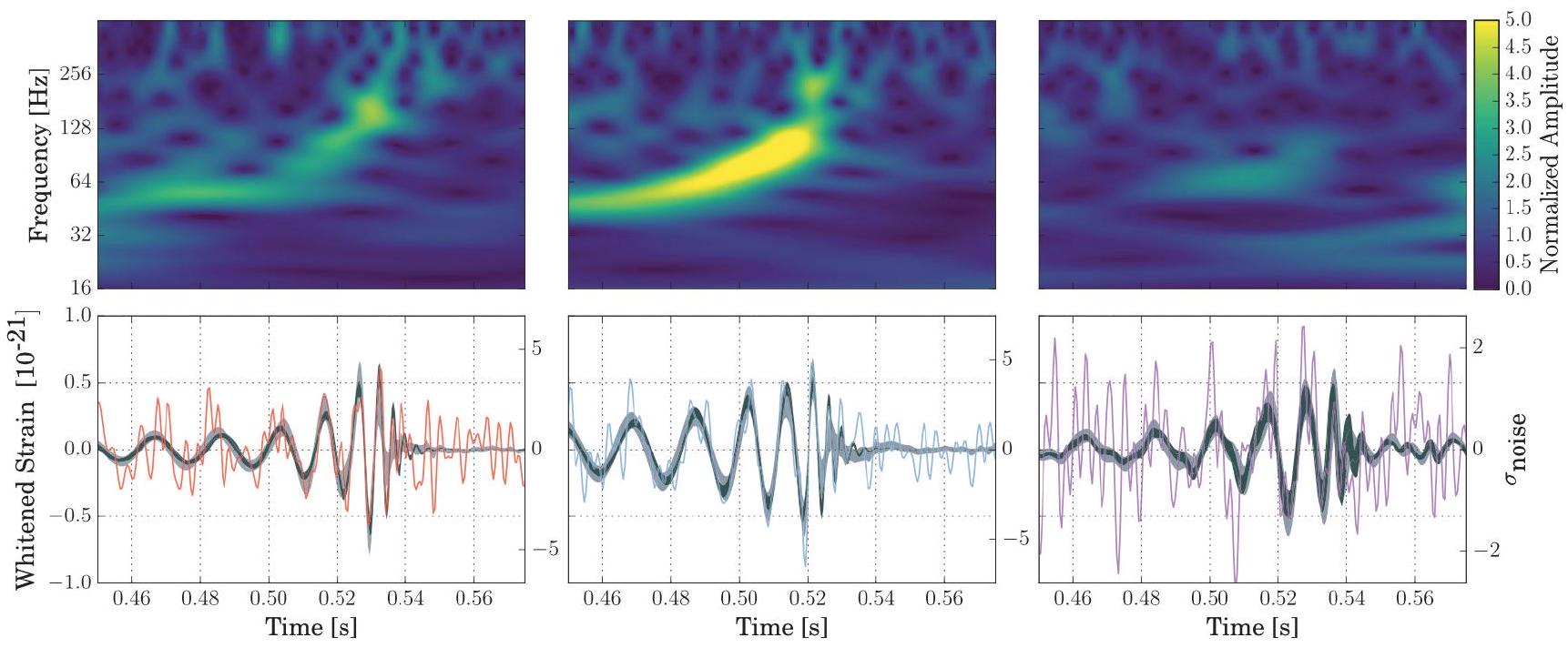 Figure 2 - De gauche à droite : ondes gravitationnelles enregistrées par les détecteurs H1 (à gauche), L1 (au centre) et Virgo (à droite) le 14 août 2017. En bas : variation de l'amplitude de l'onde gravitationnelle en fonction du temps. Les traits fins représentent le signal mesuré, qui est bruité, et les bandes grises représentent la contribution estimée de la source astrophysique. En haut : fréquence de l'onde en fonction du temps. [Extrait de B. P. Abbott et al., Physical Review Letters, volume 119, 141101 (2017).]