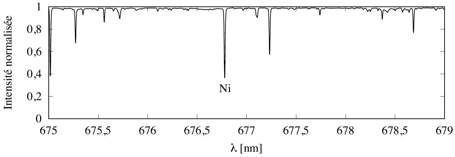 Figure 1 - Détail du spectre du rayonnement solaire autour de la raie du nickel. [Source : BASS2000 - Observatoire de Paris-Meudon - LESIA.]