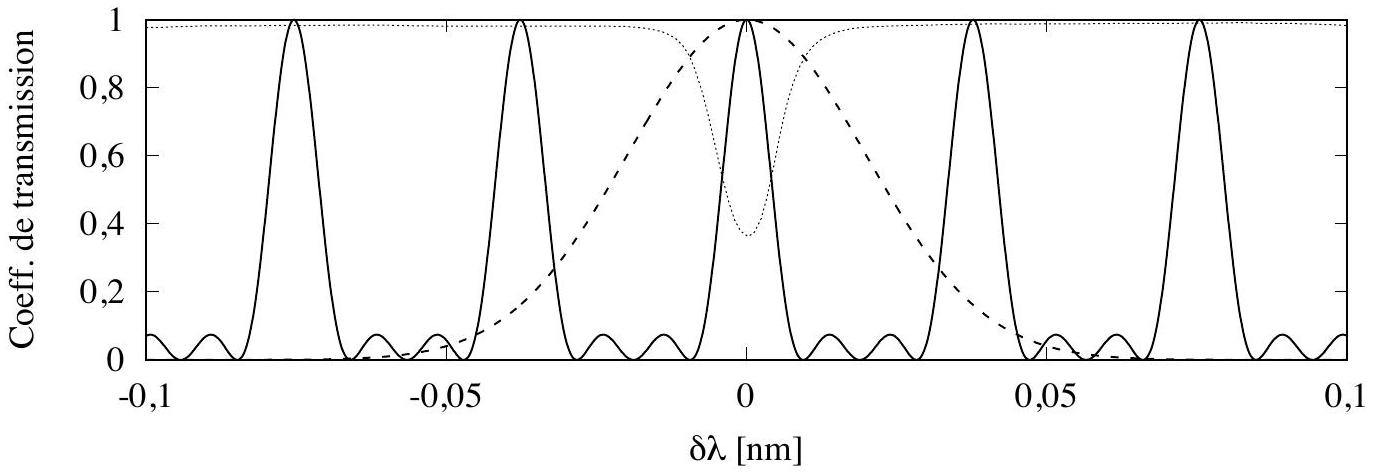 Figure 2 - Décomposition du filtrage opéré par l'instrument MDI en fonction de . La ligne pointillée représente la raie du nickel, la ligne tiretée le coefficient de transmission du filtre de Lyot placé en entrée, et la ligne pleine le coefficient de transmission du système des deux interféromètres de Michelson qui le suit.